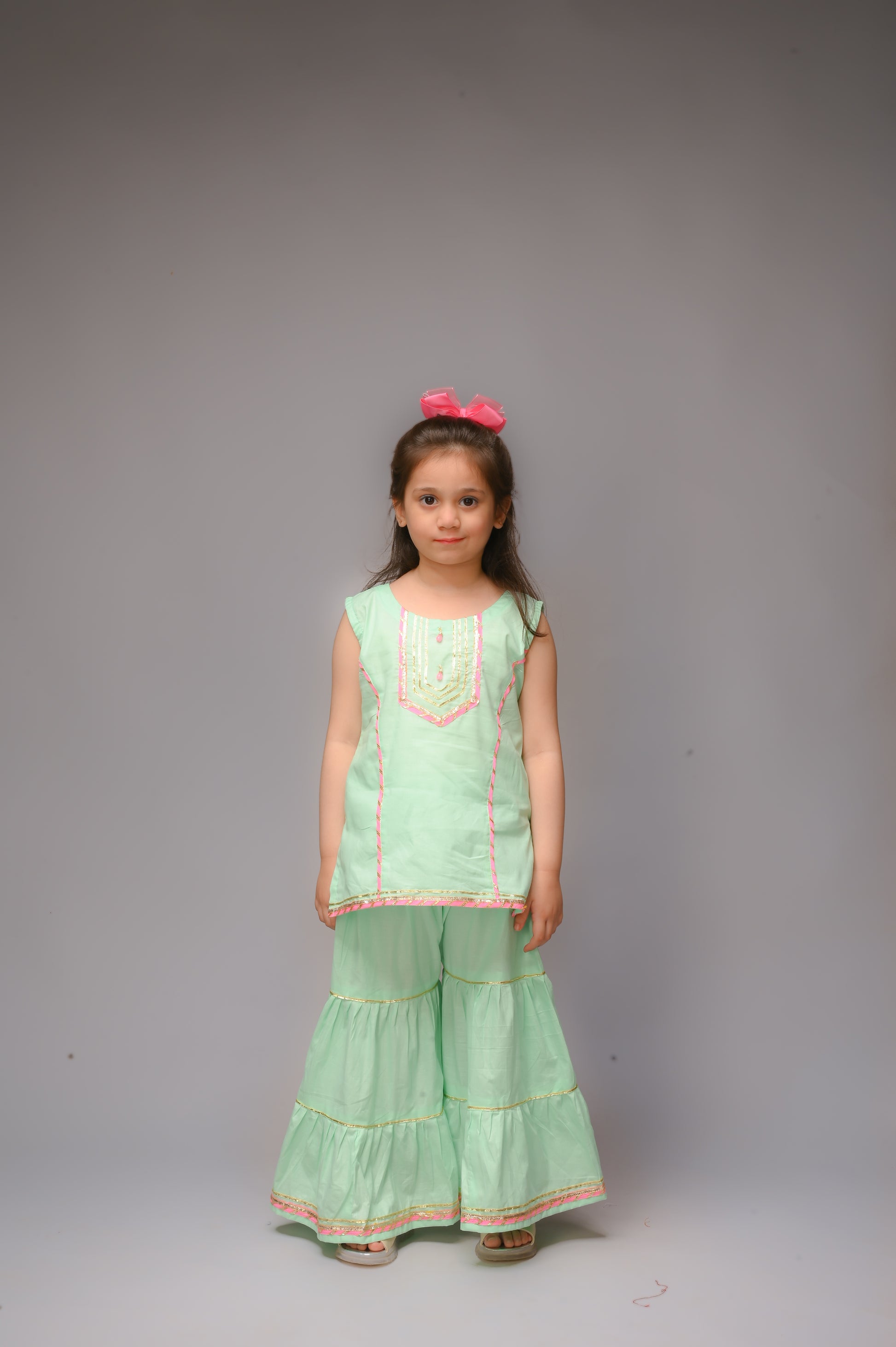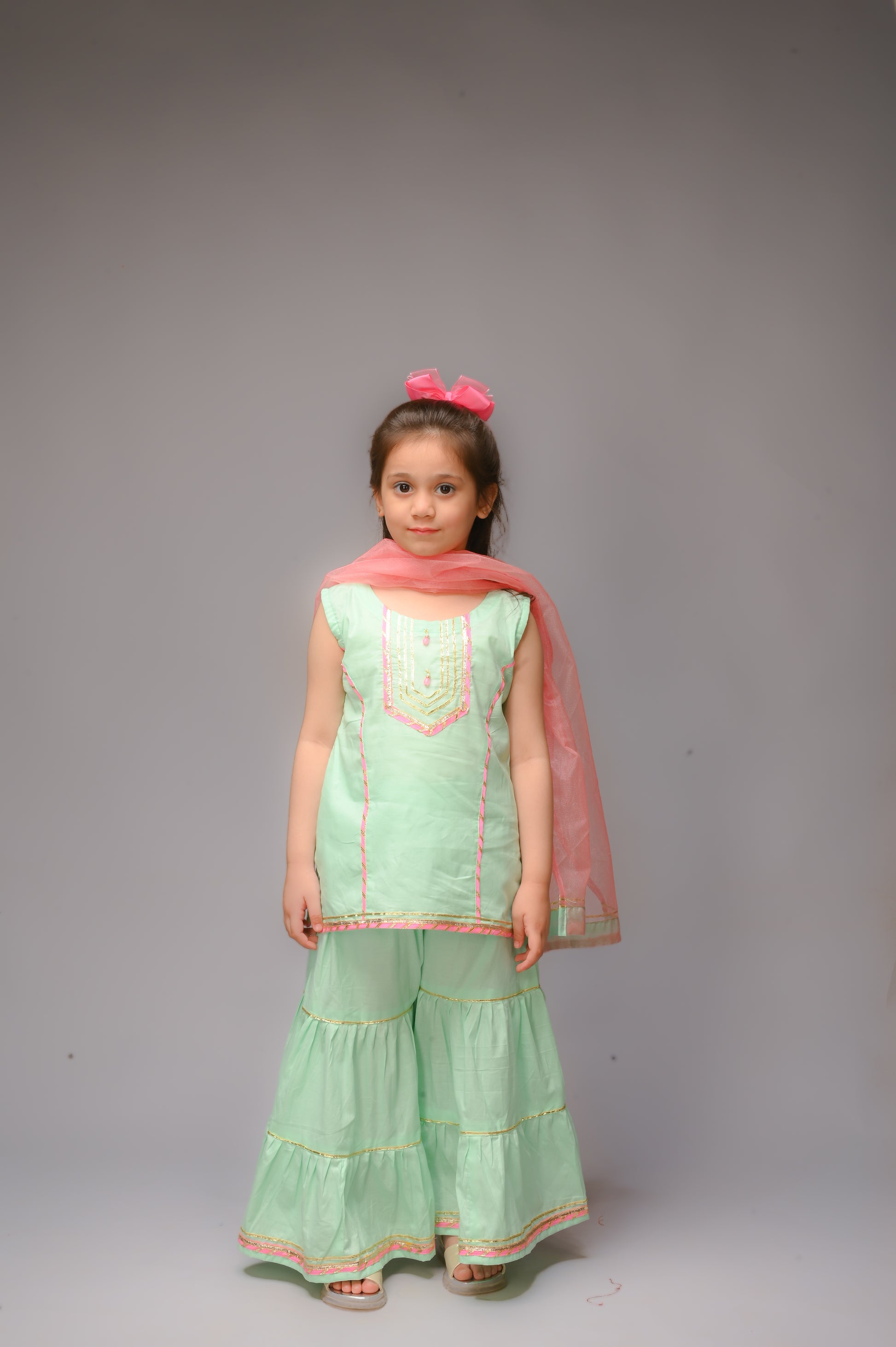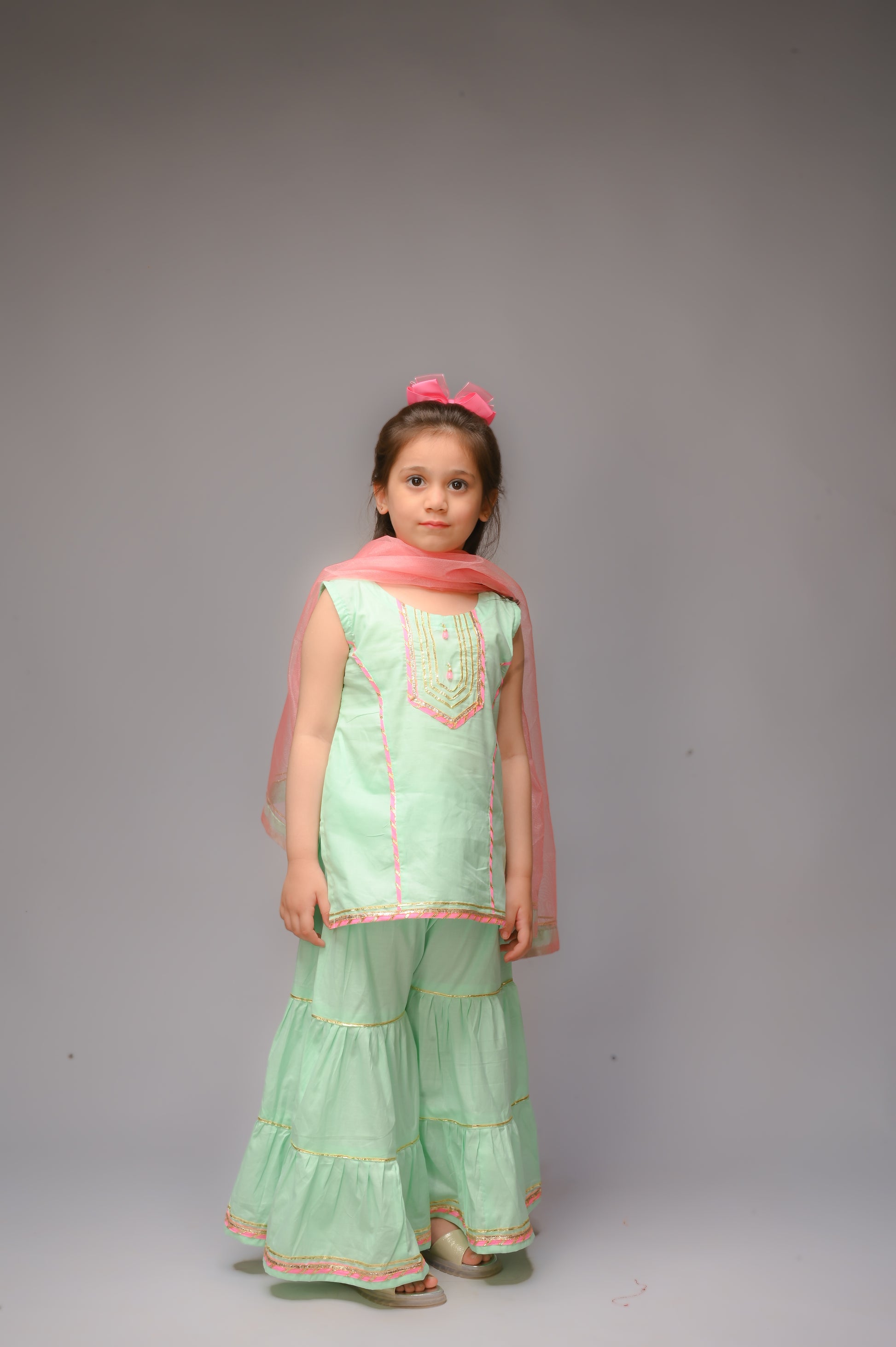 3 piece Aqua Green (Cyan) Cotton Sleeveless Gharara Suit with Baby Pink net Dupatta & Baby Pink & Golden Laces.(Stitch)