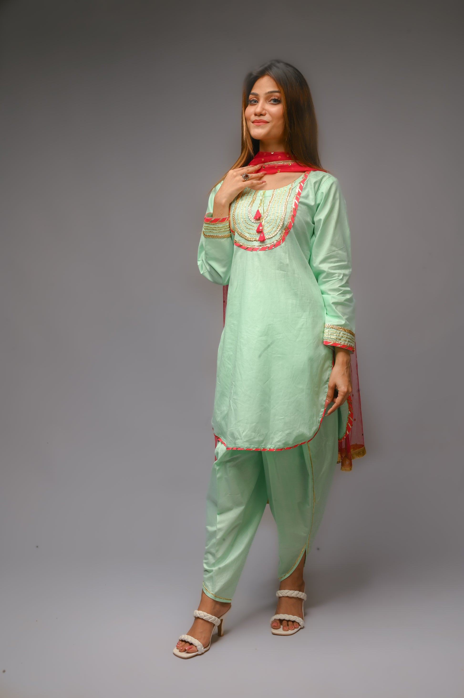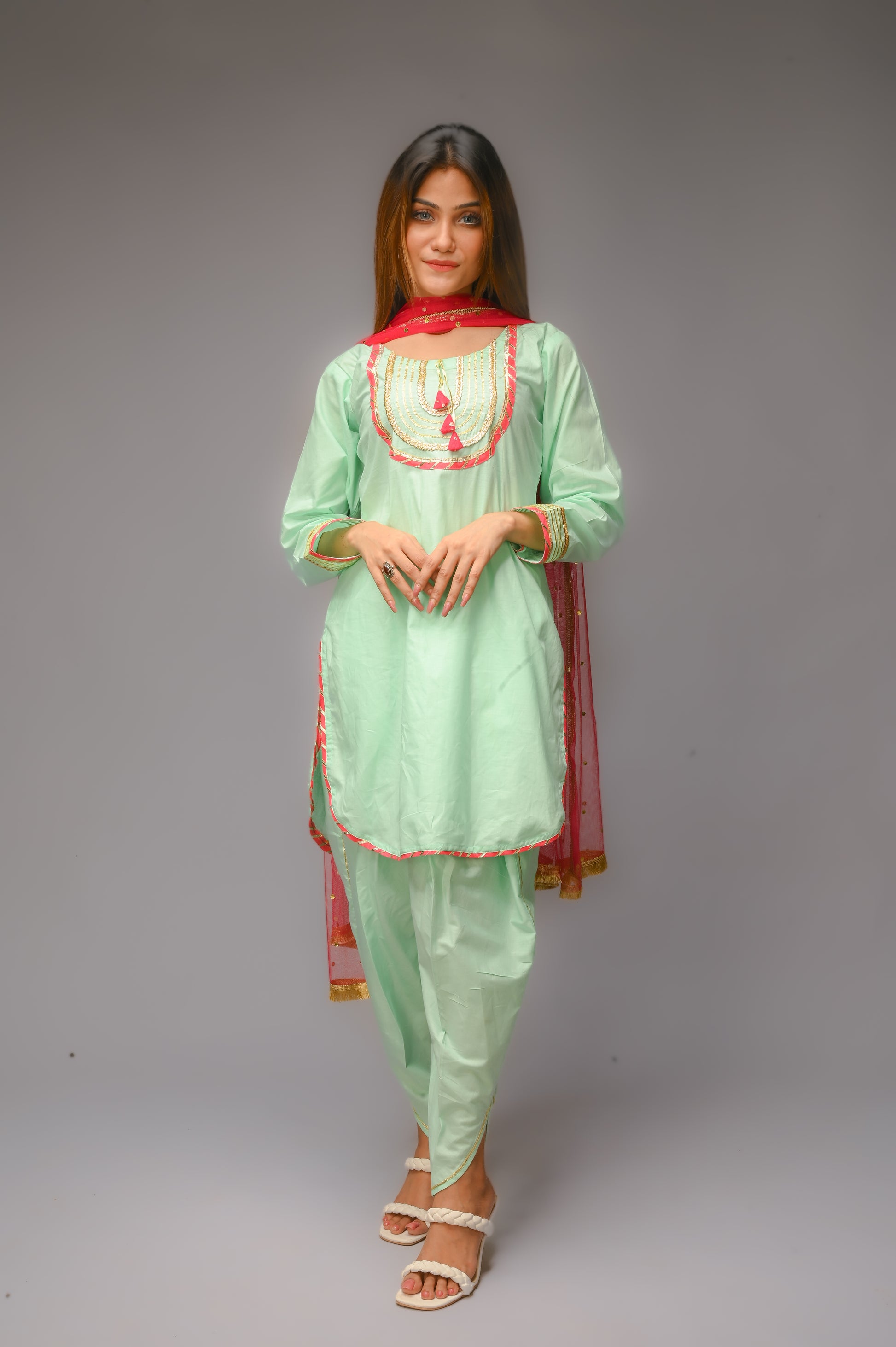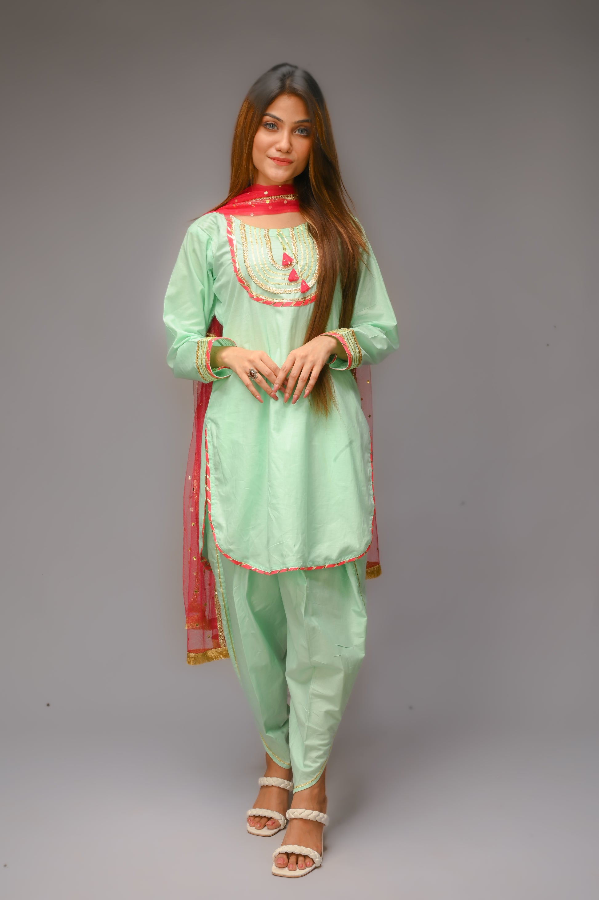 3 piece Aqua Green(Cyan) Cotton Tulip Suit with Carrot Pink net Dupatta & Golden Laces.(Stitch)