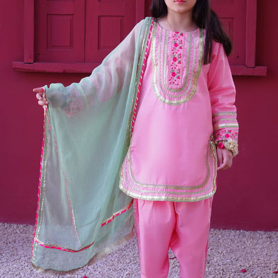 3 piece Baby Pink Embroidered Cotton Tulip Suit with Pistachio Green Chiffon Dupatta & Laces.(Stitch)