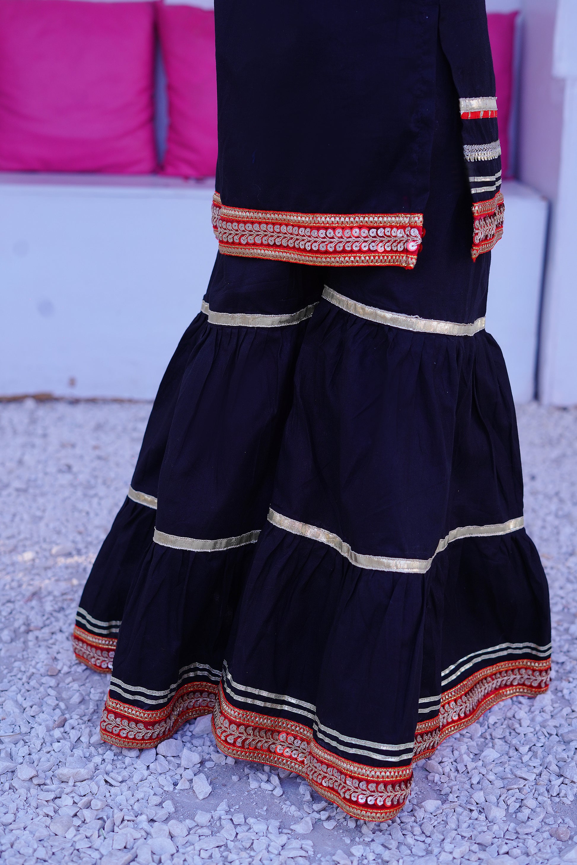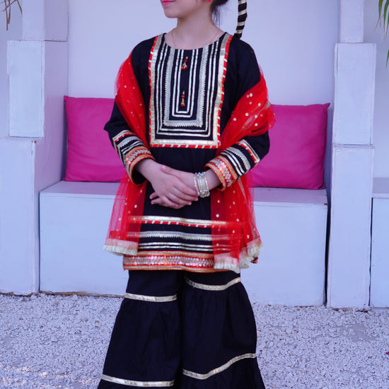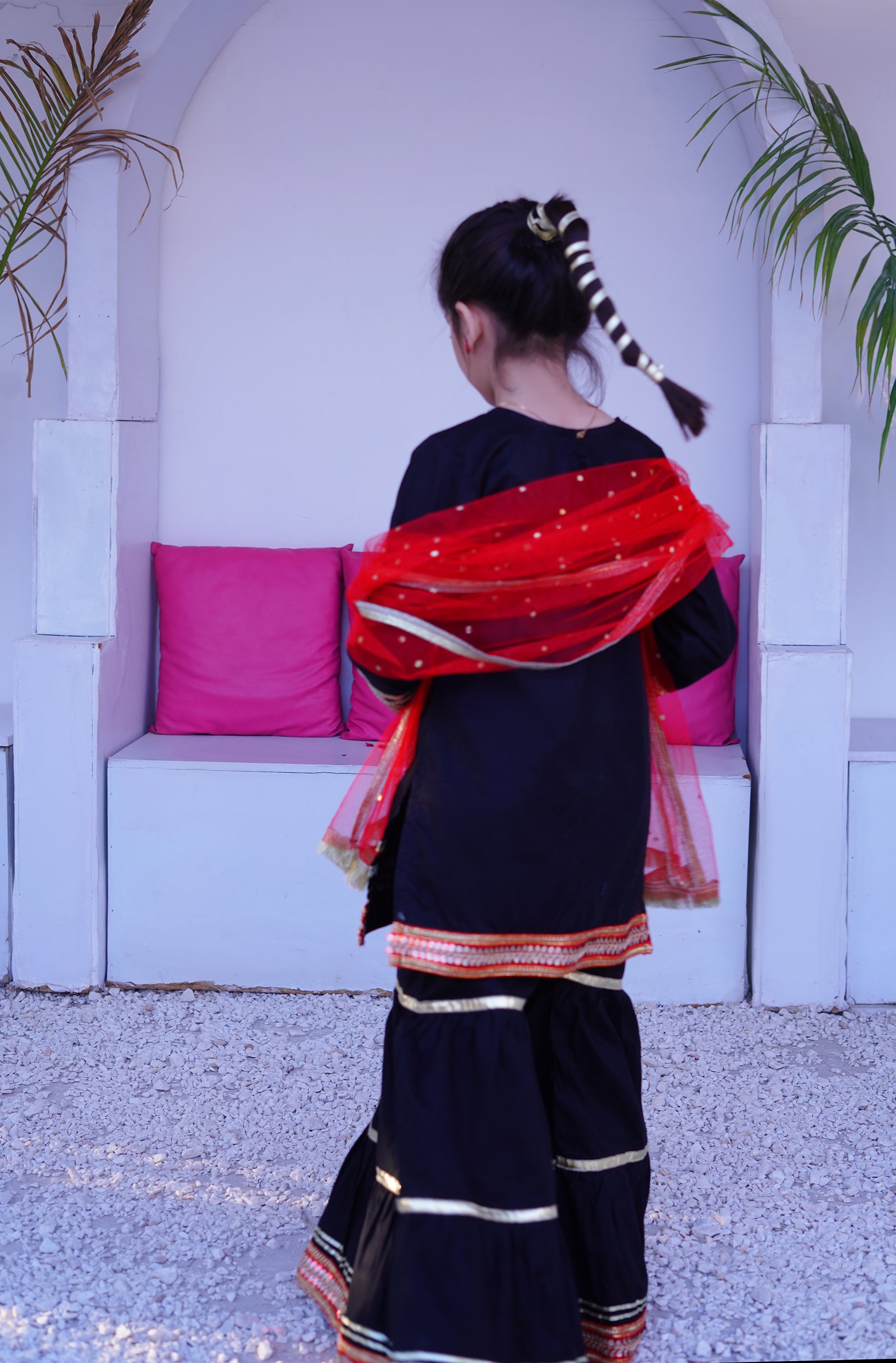 3 piece Beautiful BLACK JET Cotton Gharara Suit with Red net Dupatta & Laces.(Stitch)