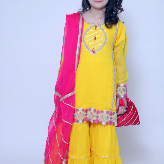 3 piece Beautiful Stunning Yellow Chiffon Gharara Suit with Shocking Pink Chiffon Dupatta & multicolor Laces.(Stitch)