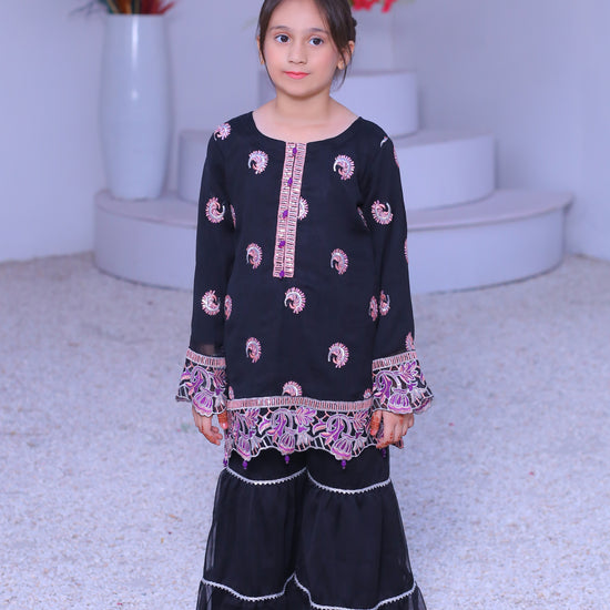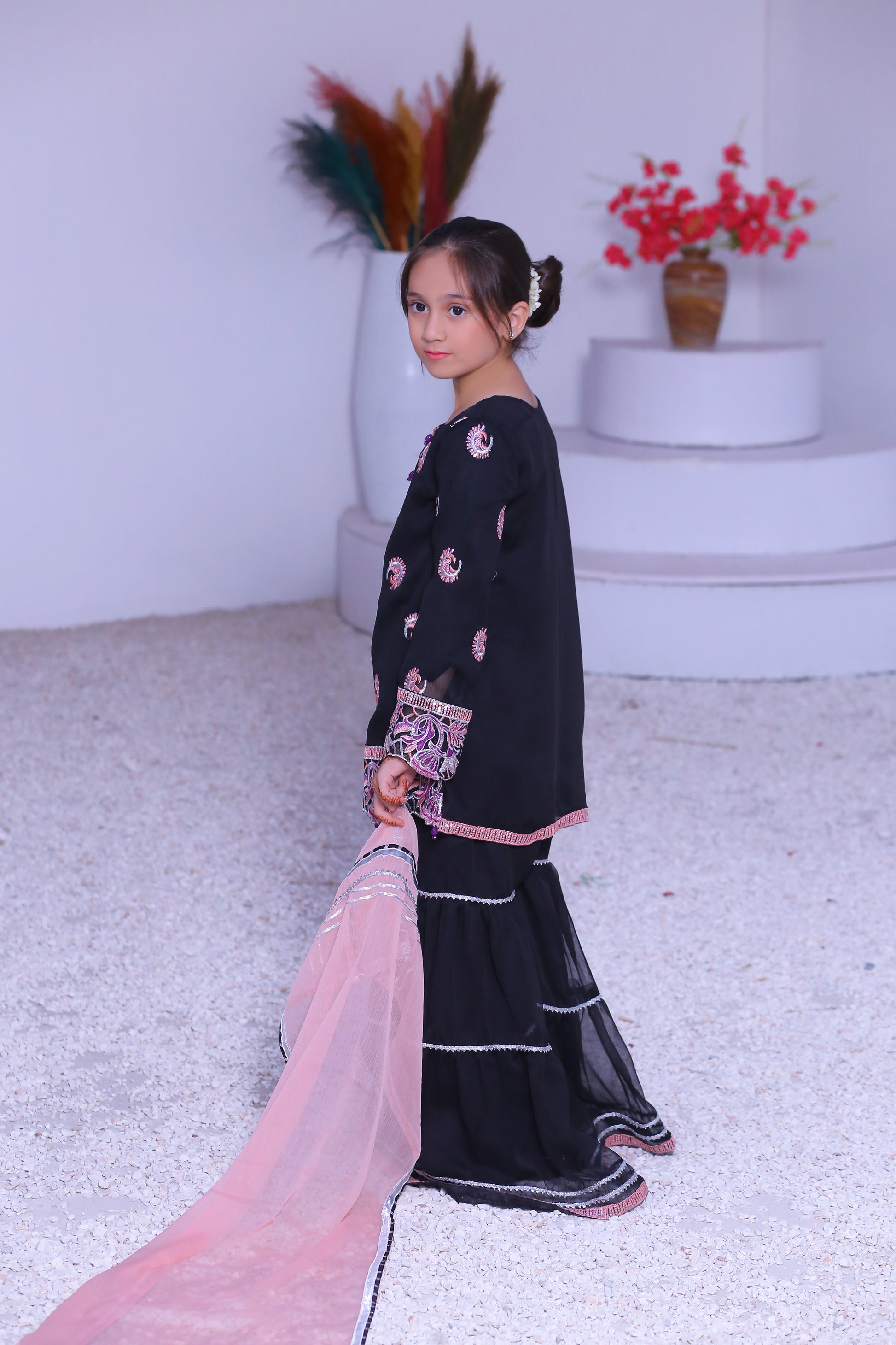 Premium Export Quality – Beautiful Stunning 3-Piece Black Embroidered Chiffon Gharara Suit (Stitched).