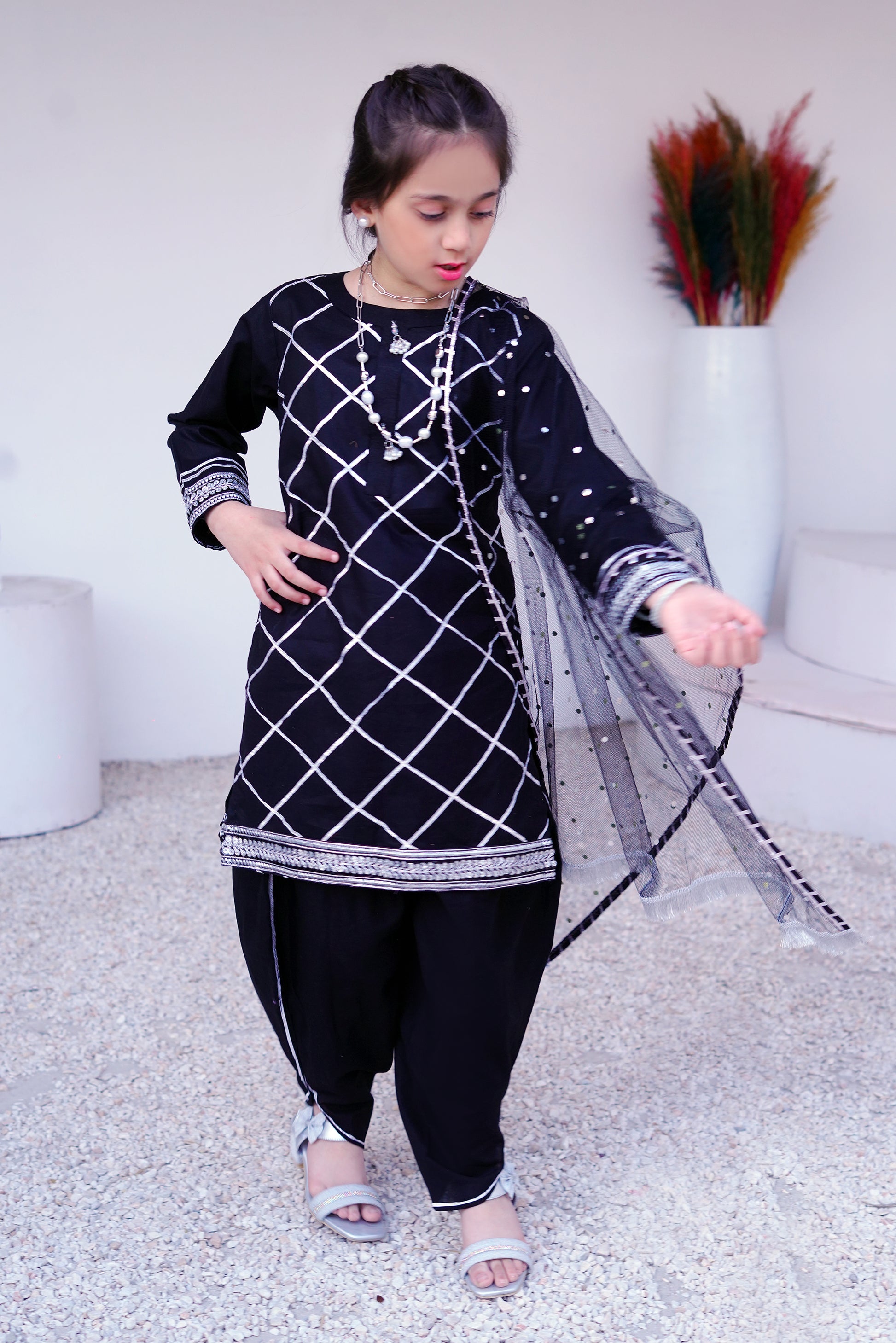3 piece BLACK JET Cotton Tulip Suit with Black Silver net Dupatta & Silver Laces.(Stitch).