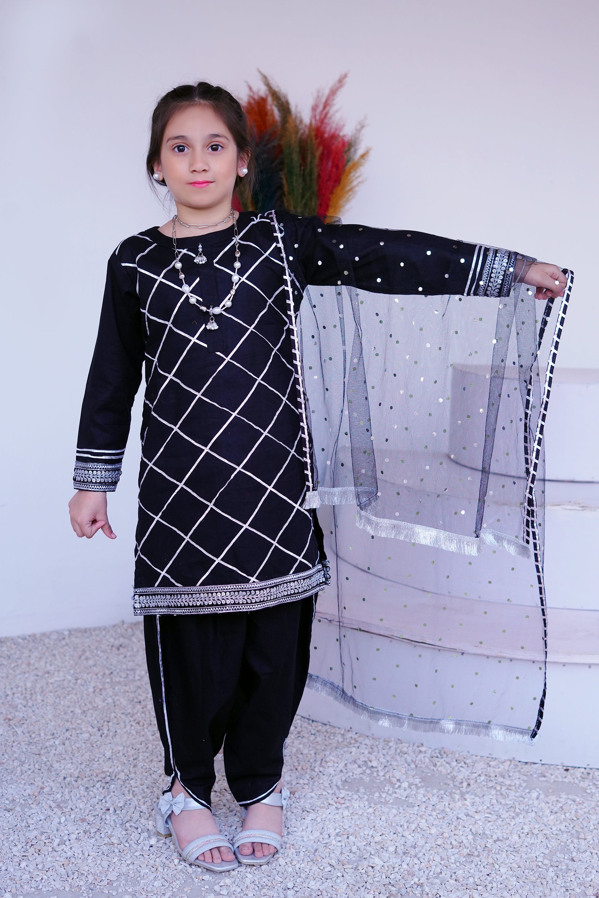 Dupatta: Sheer Black Net with elegant Silver threadwork