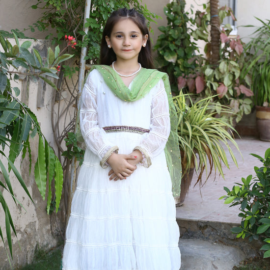 3 piece Chiffon White Frill Frock with White Malai Trouser & Pistachio Green Chan Net Dupatta & beautiful Multi Laces.(Stitch)