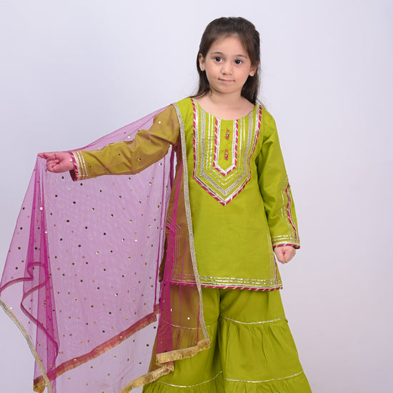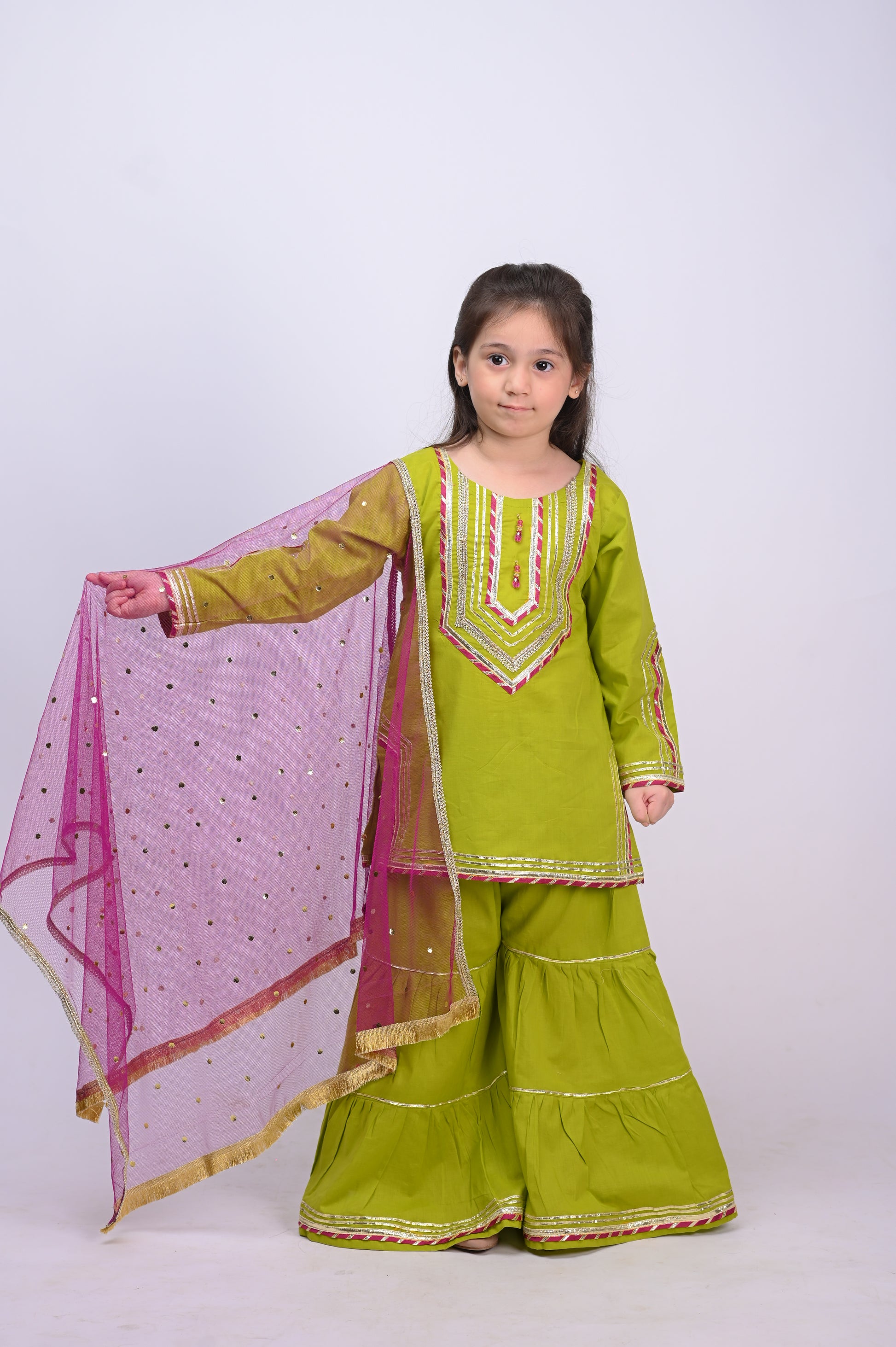 3 piece Dhani (Green) Cotton Gharara Suit with Magenta Chan net Dupatta & Laces.(Stitch)