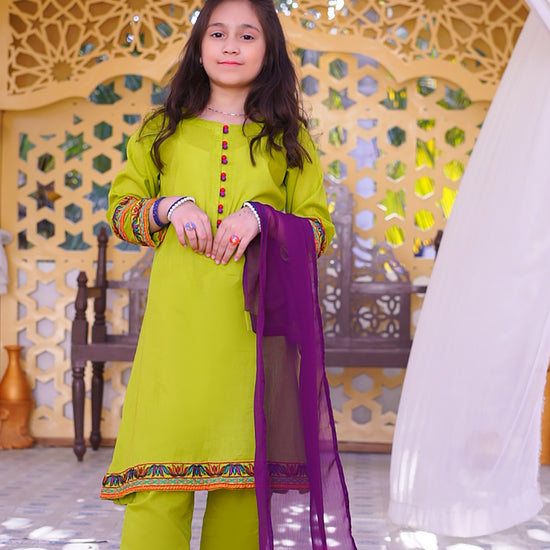 3 piece Dhani(Green) Embroidered Cotton Airline Frock Suit with Purple Chiffon Dupatta & Laces.(Stitch).