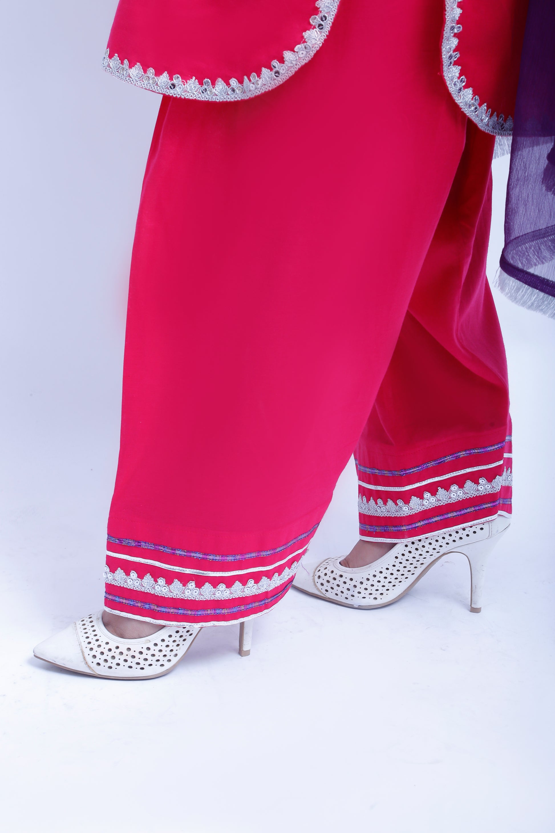 3 piece Elegant Shocking Pink Cotton Plazo Suit with Silver & Purple Laces & Purple Chiffon Dupatta. (Stitch)
