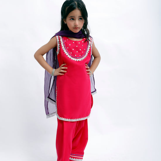 3 piece Elegant Shocking Pink Cotton Sleeveless Plazo Suit with Silver & Purple Laces & Purple Chiffon Dupatta. (Stitch)