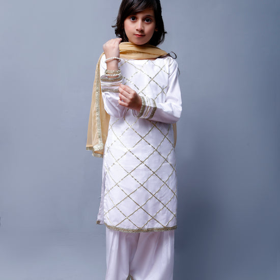 3 piece Elegant White Cotton Plazo Shalwar Kameez Suit with Golden Laces & Golden Chiffon Dupatta.(Stitch)