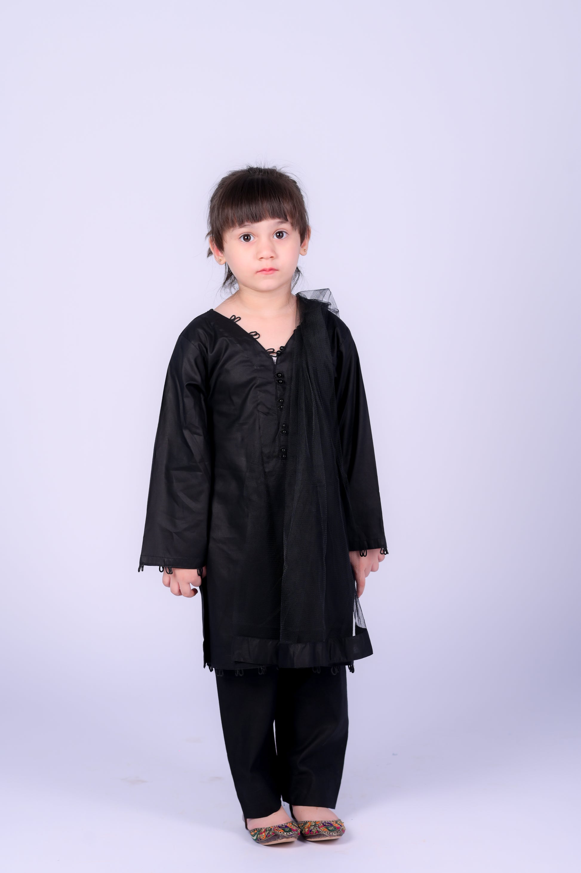 3 piece JET BLACK Cotton Suit with Black net Dupatta.(Stitch)