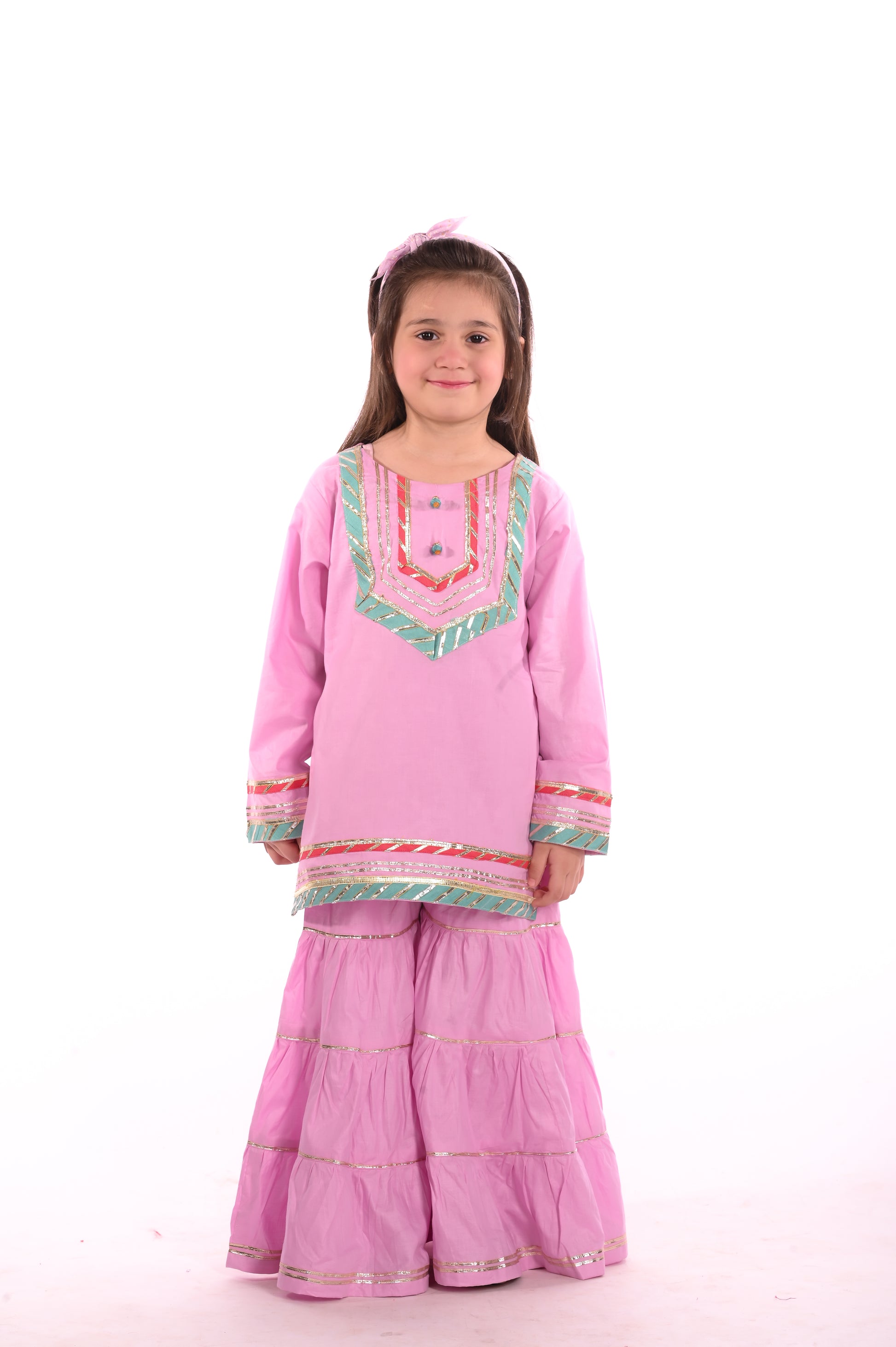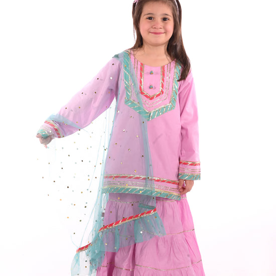 3 piece Light Purple Cotton Gharara Suit with Ferozi net Dupatta & Laces.(Stitch).