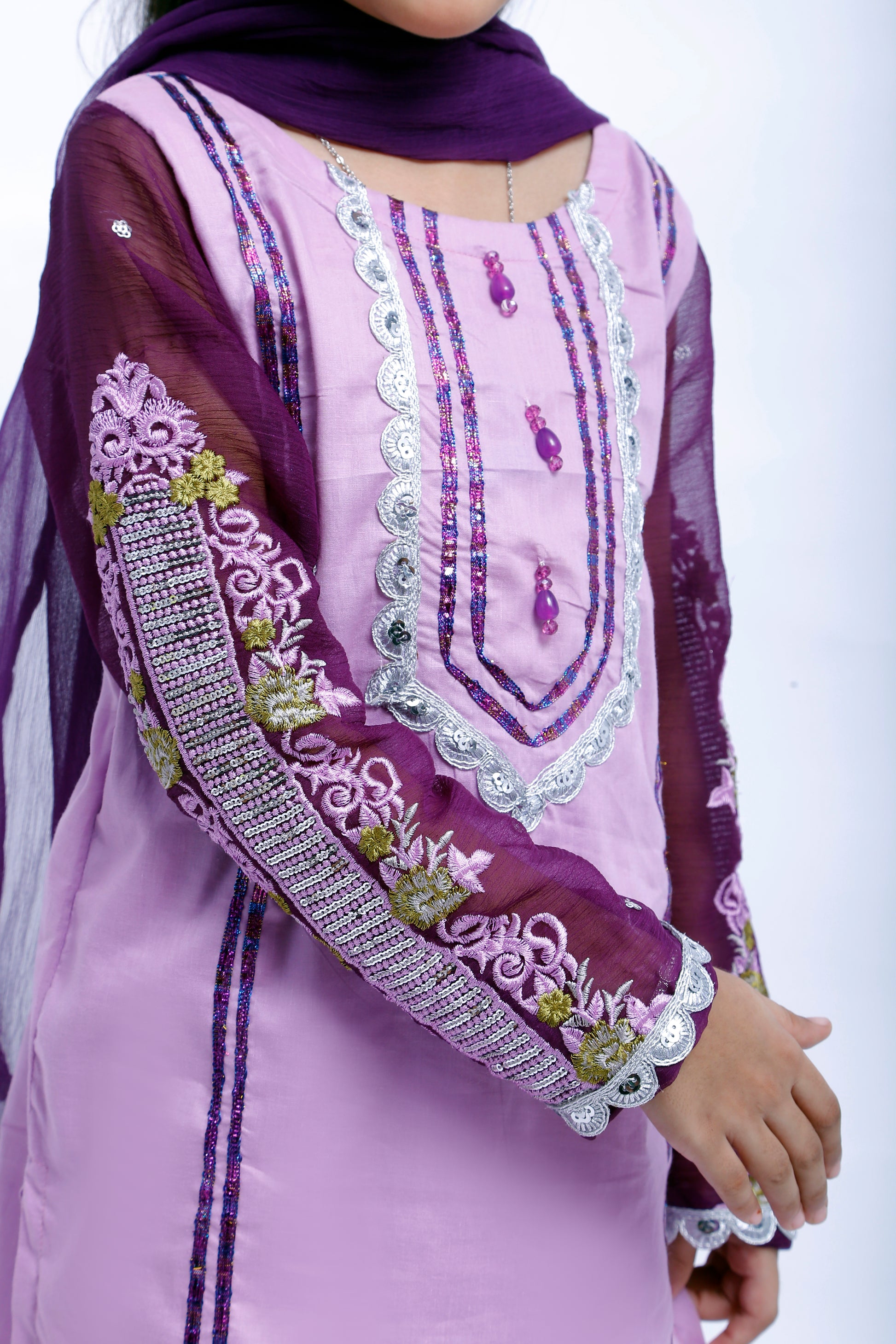 Top: Light purple kameez adorned with silver and purple lace detailing