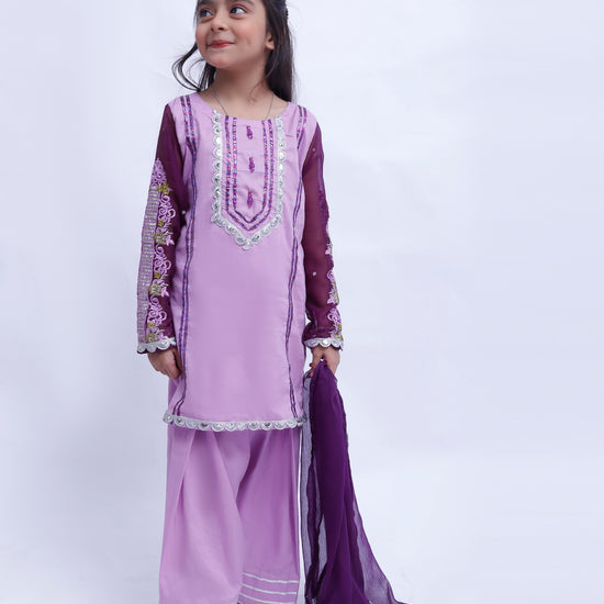 3 piece Light Purple Plazo Suit with Beautiful Silver Sitara Embroidered Purple Chiffon Sleeves & Purple Chiffon Dupatta. (Stitch)