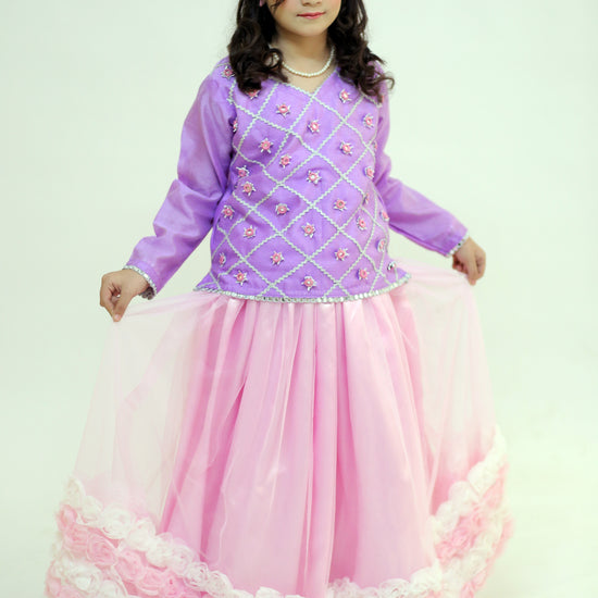 Premium Export Quality Classical| 3-Piece Light Purple Shirt with Baby Pink Floral Lehenga & Dupatta (Stitched).