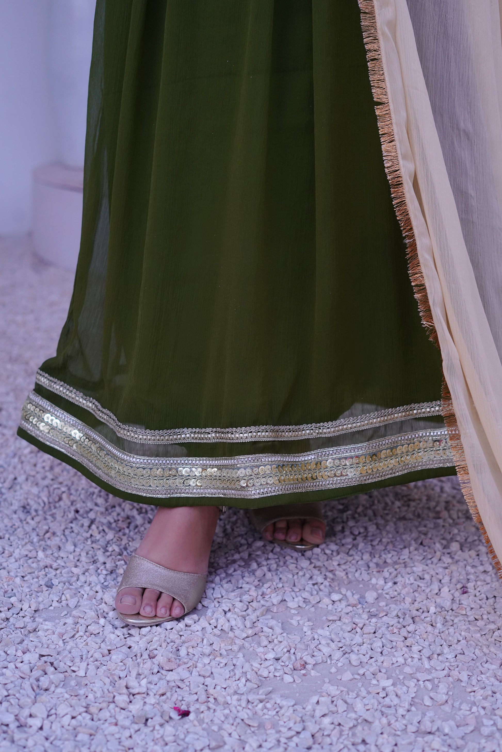3 piece Mehdi Green Chiffon MAXI with Golden Chiffon Dupatta & Laces with Tussles.(Stitch)