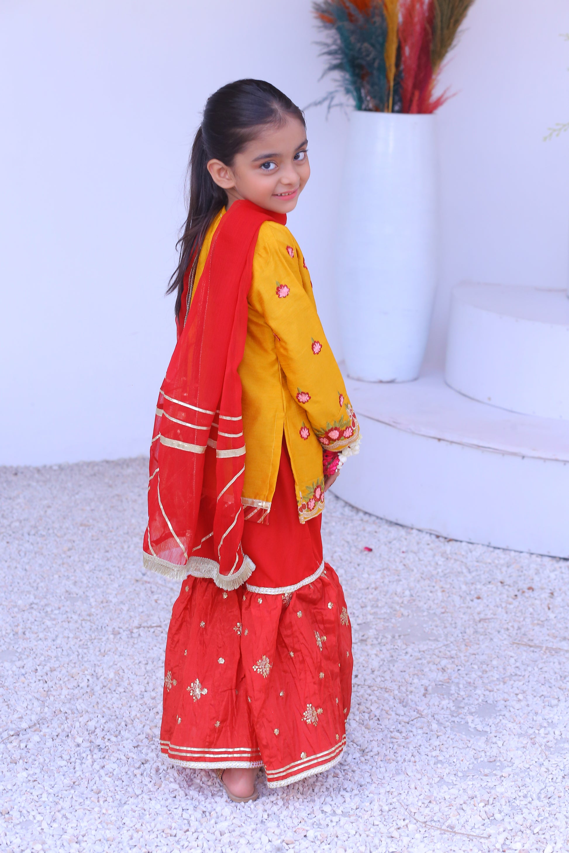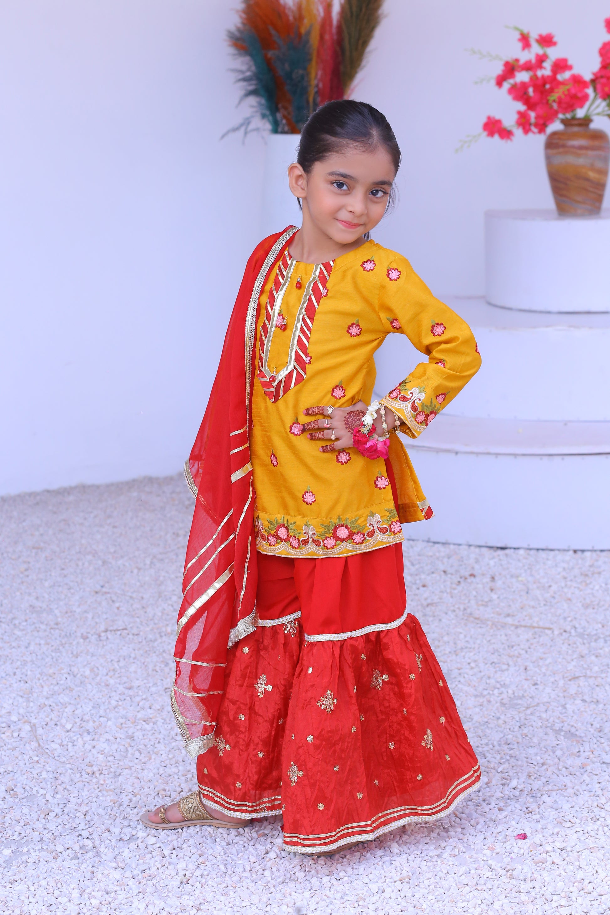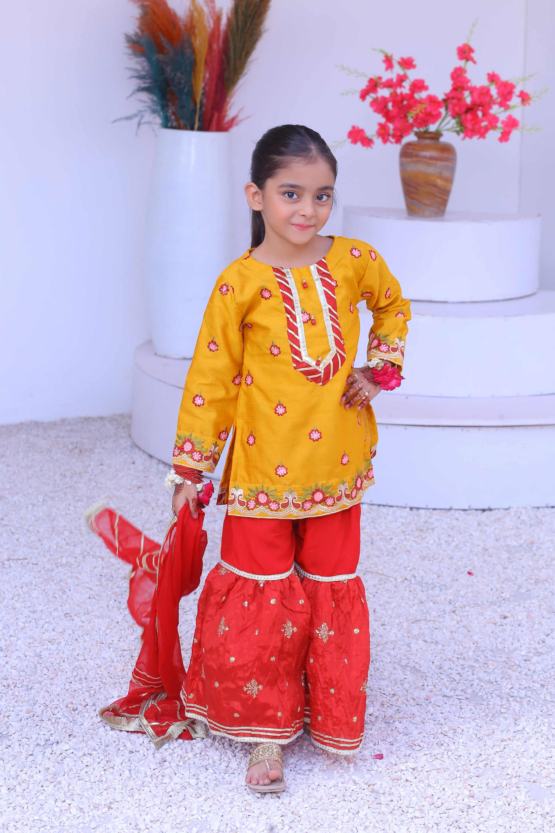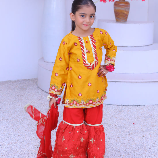 Premium Export Quality - Beautiful 3-Piece Mustard Embroidered Raw Silk Gharara Suit (Stitched).
