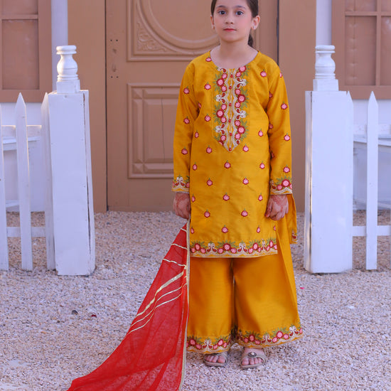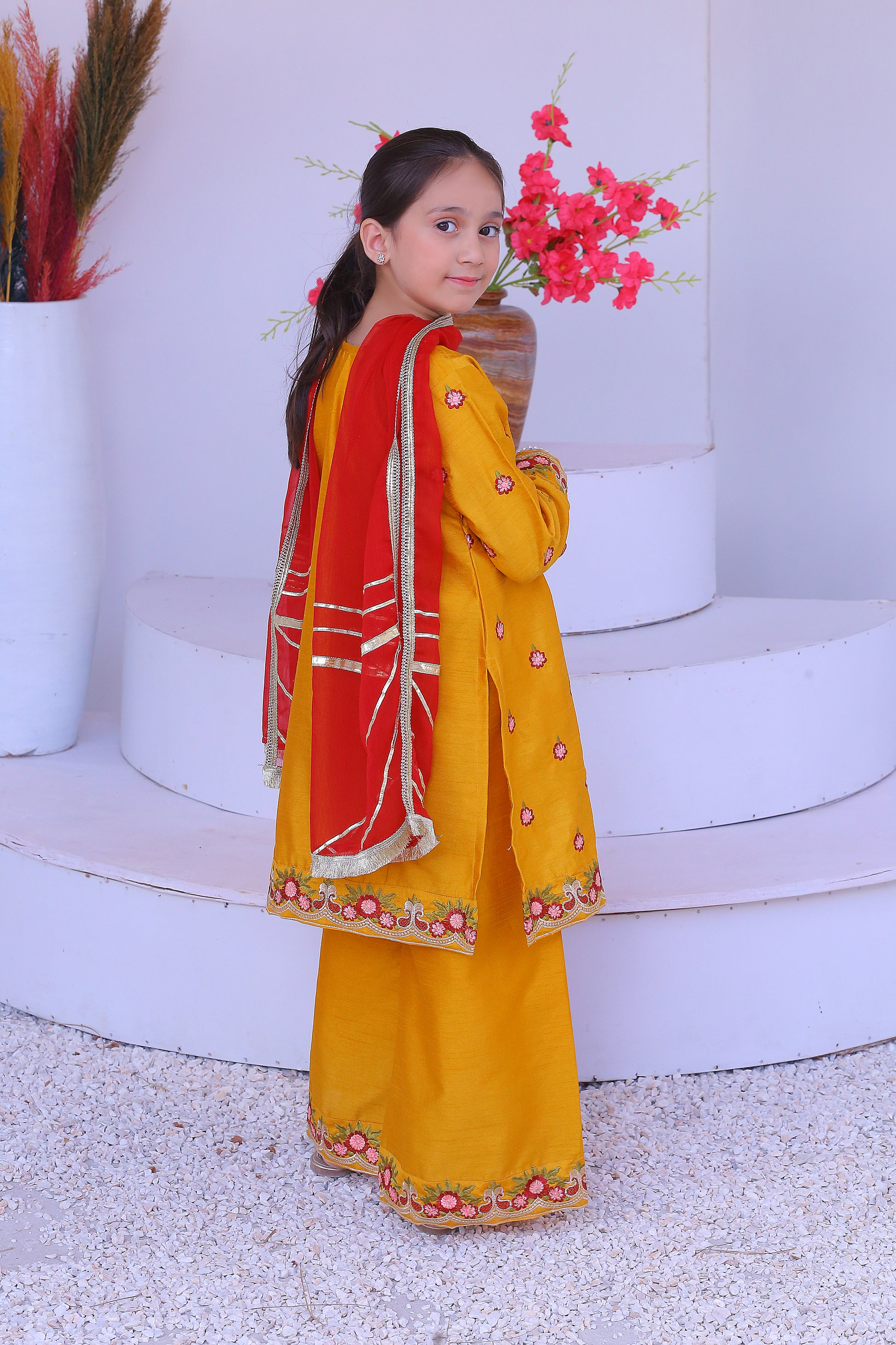Premium Export Quality – Beautiful 3-Piece Mustard Raw Silk Embroidered Plazo Suit.