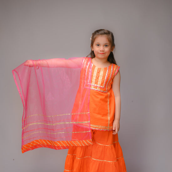 3 piece Orange Cotton Sleeveless Gharara Suit with Shocking Pink net Dupatta & Shocking Pink & Golden Laces.(Stitch).