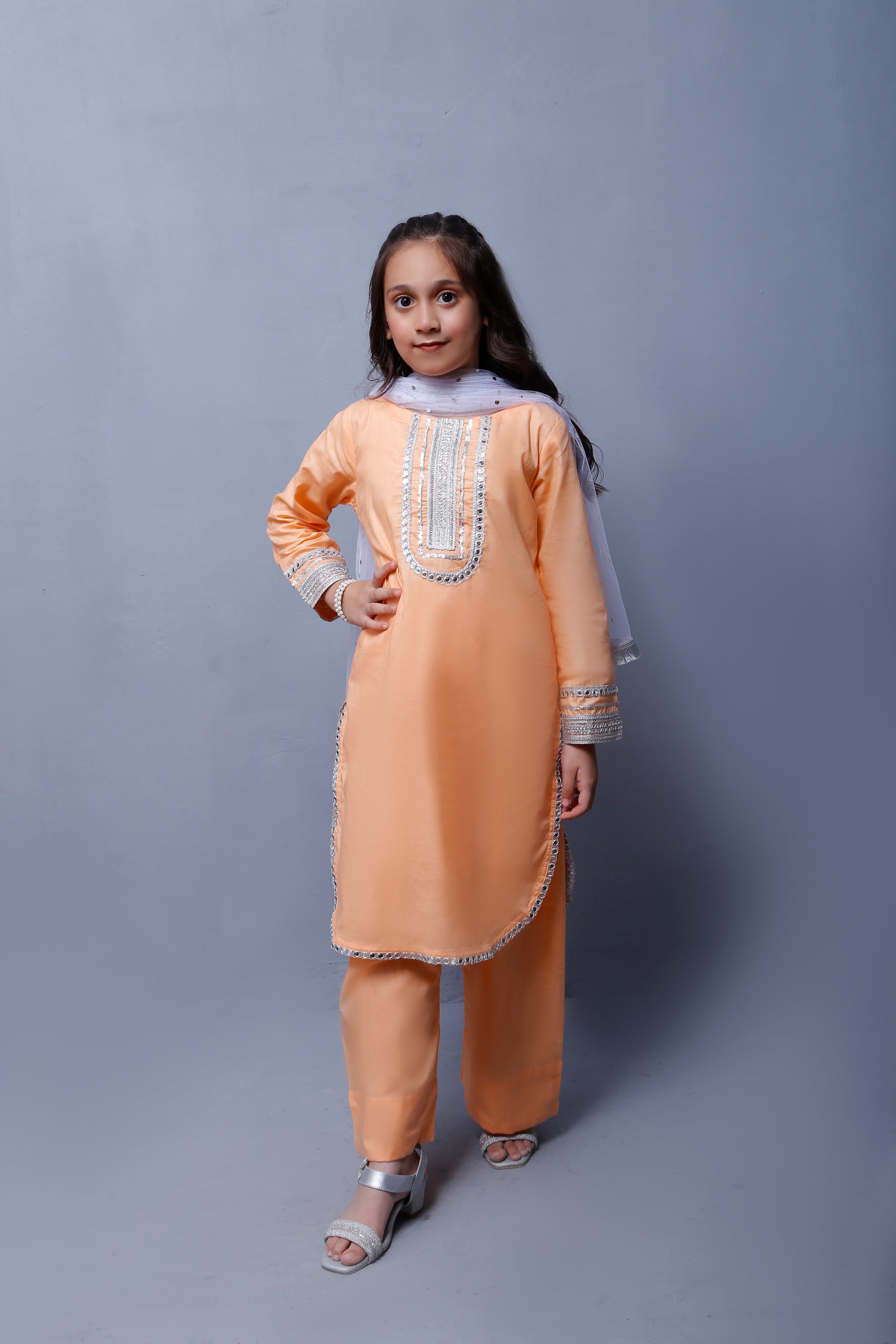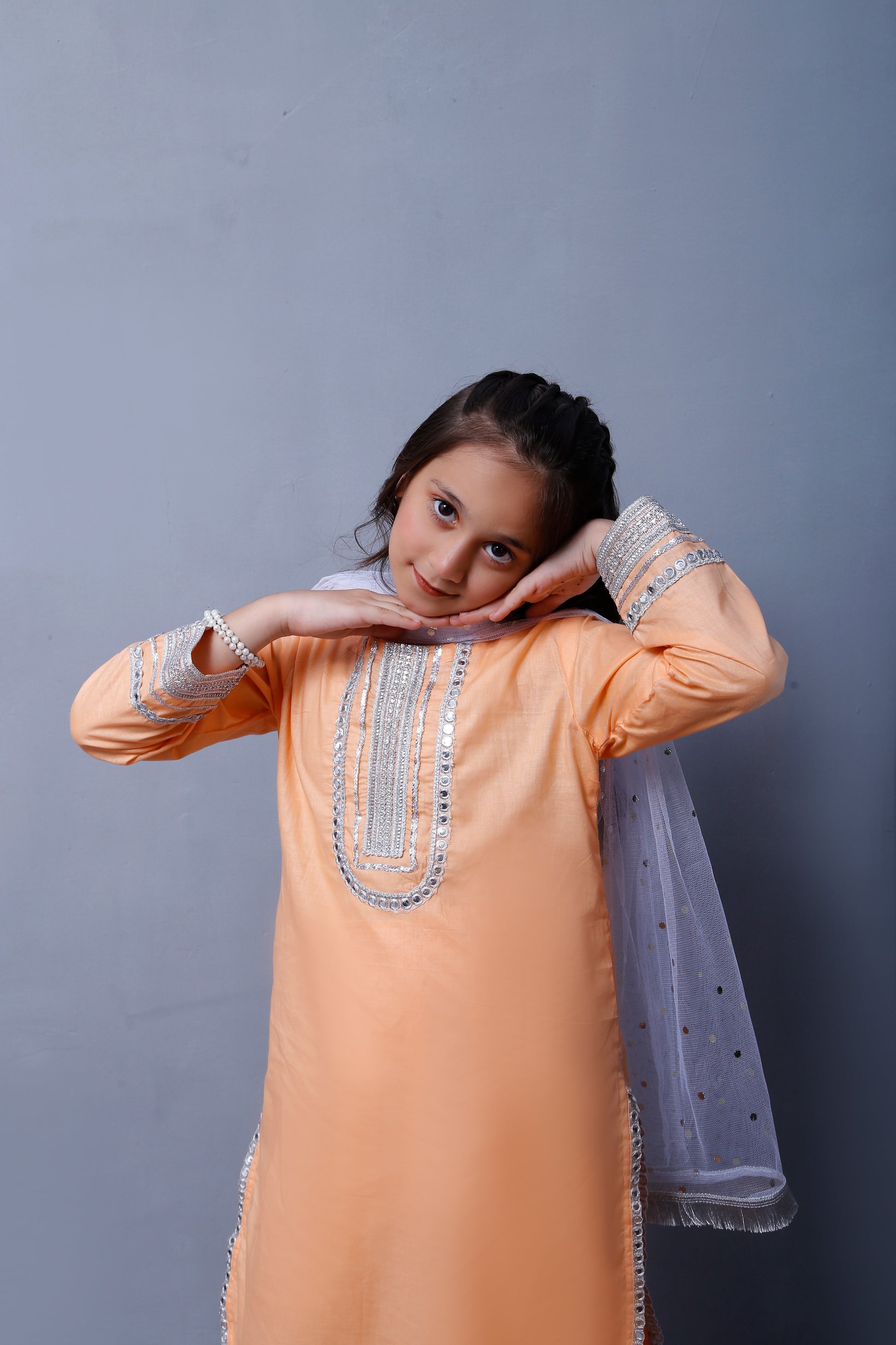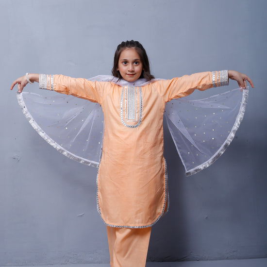 3 piece Peach Cotton Plazo Shalwar Kameez Suit with White/Silver Laces & White/Silver net chan Dupatta.(Stitch)