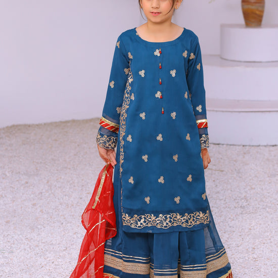 3 piece Peacock Embroidered Chiffon Long Shirt Lehenga Suit With Reddish Maroon Chiffon Dupatta & Golden Laces.(Stitch)
