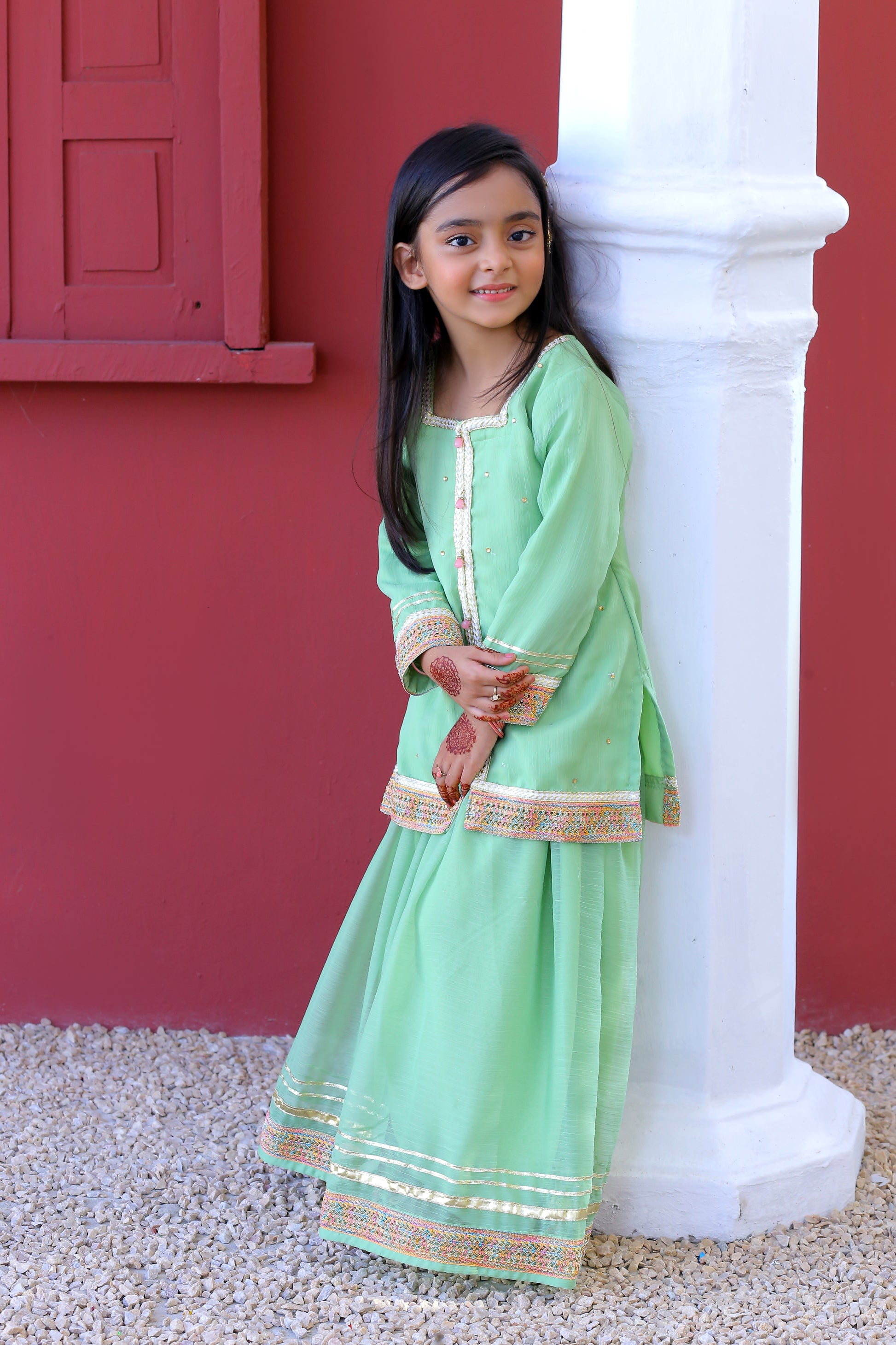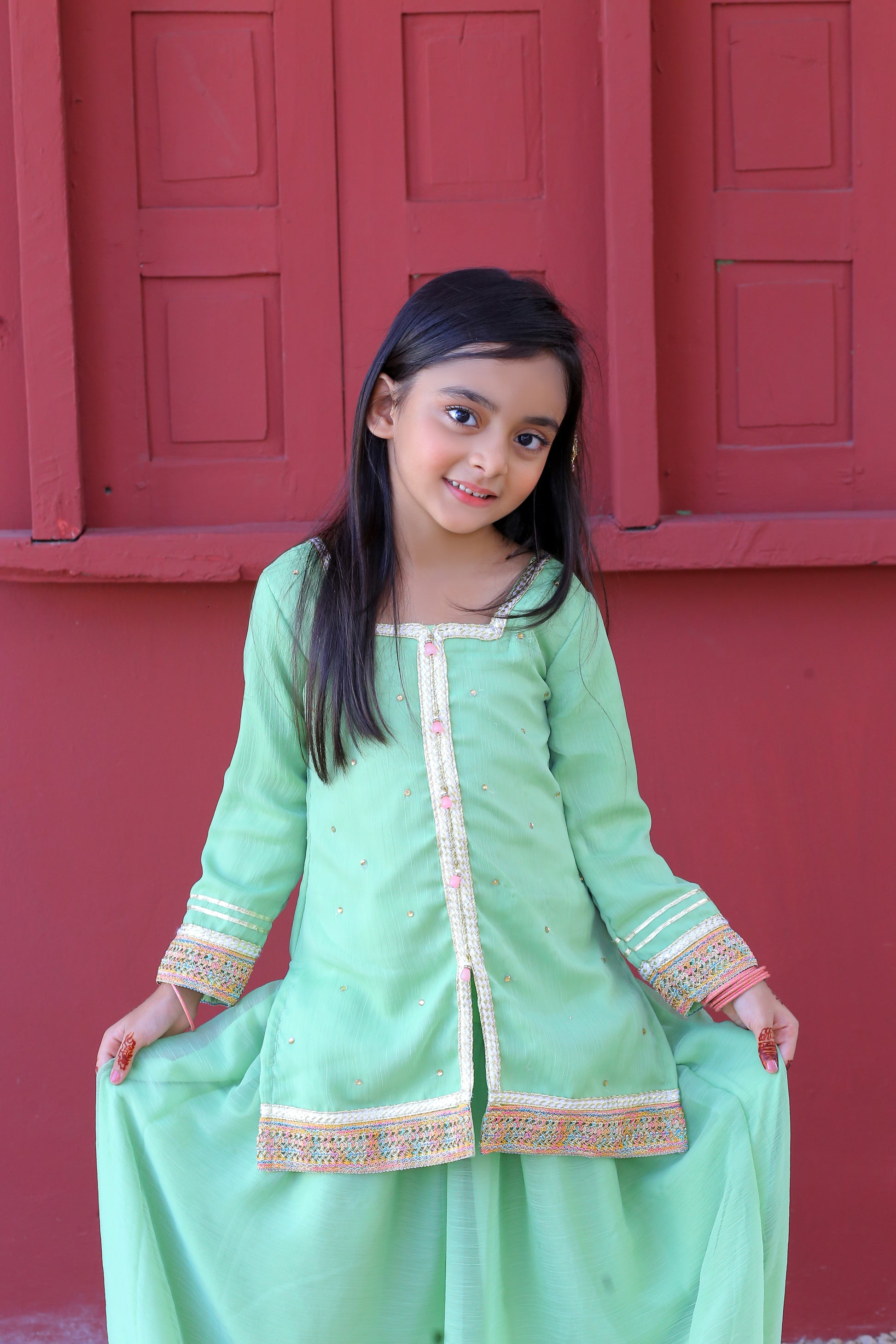 3 piece Pistachio Green Chiffon Lehenga Suit with Baby Pink Chiffon Dupatta & Multicolor & Golden Laces .(Stitch)