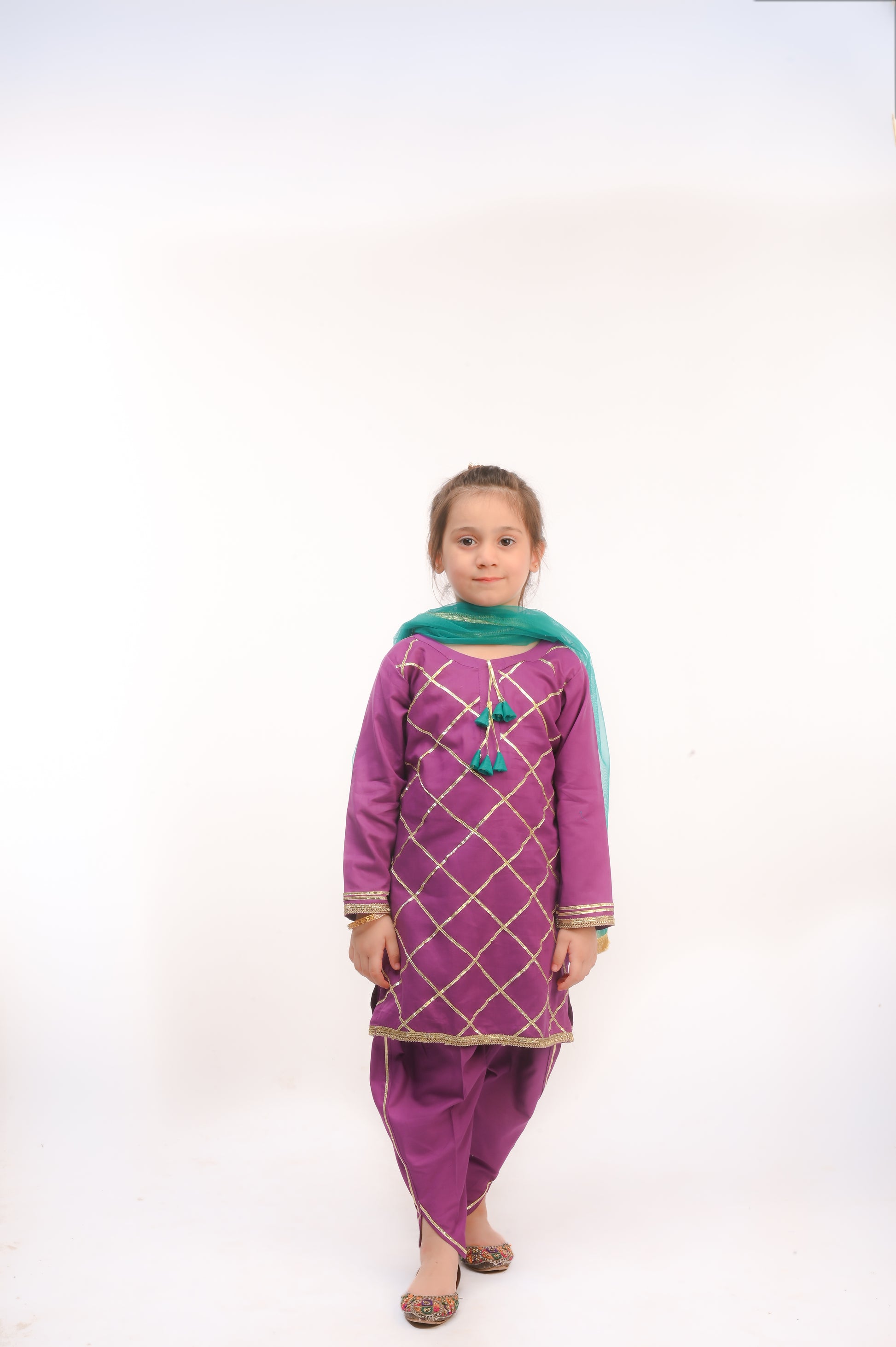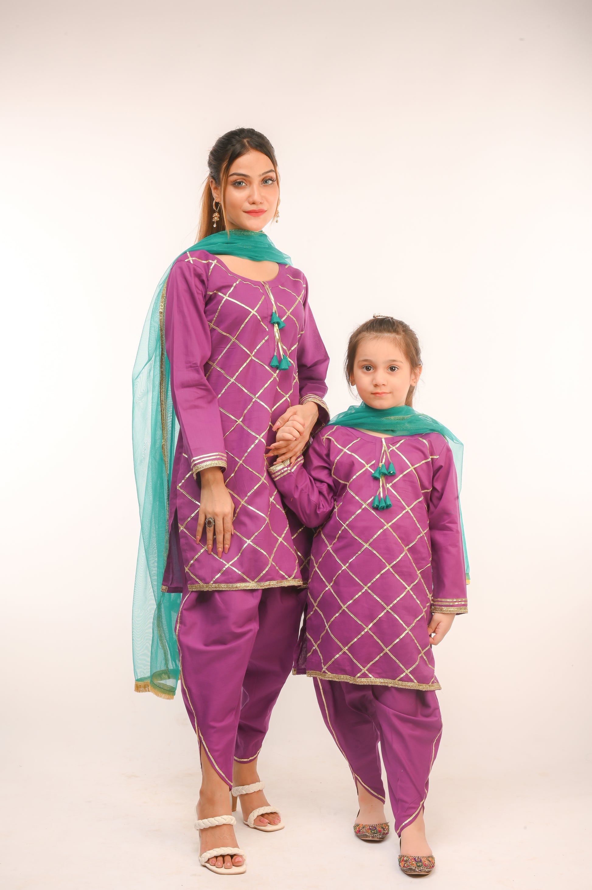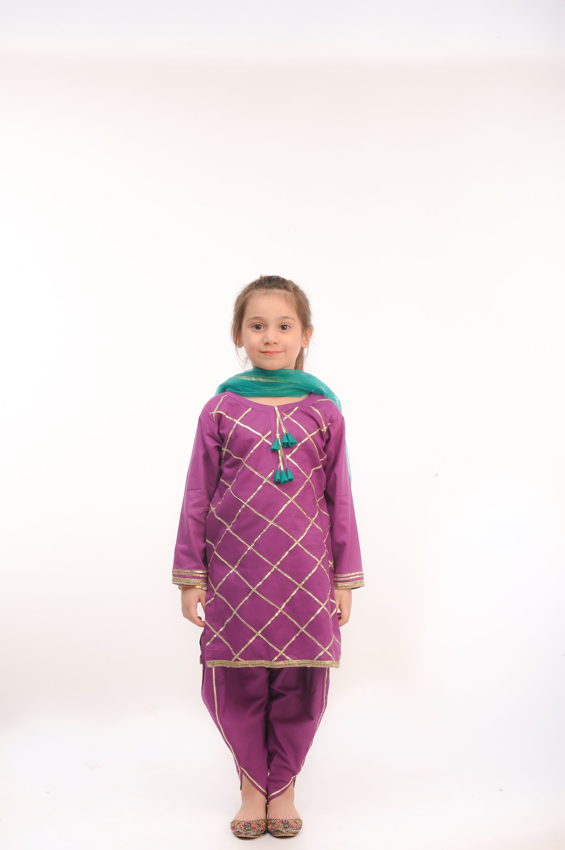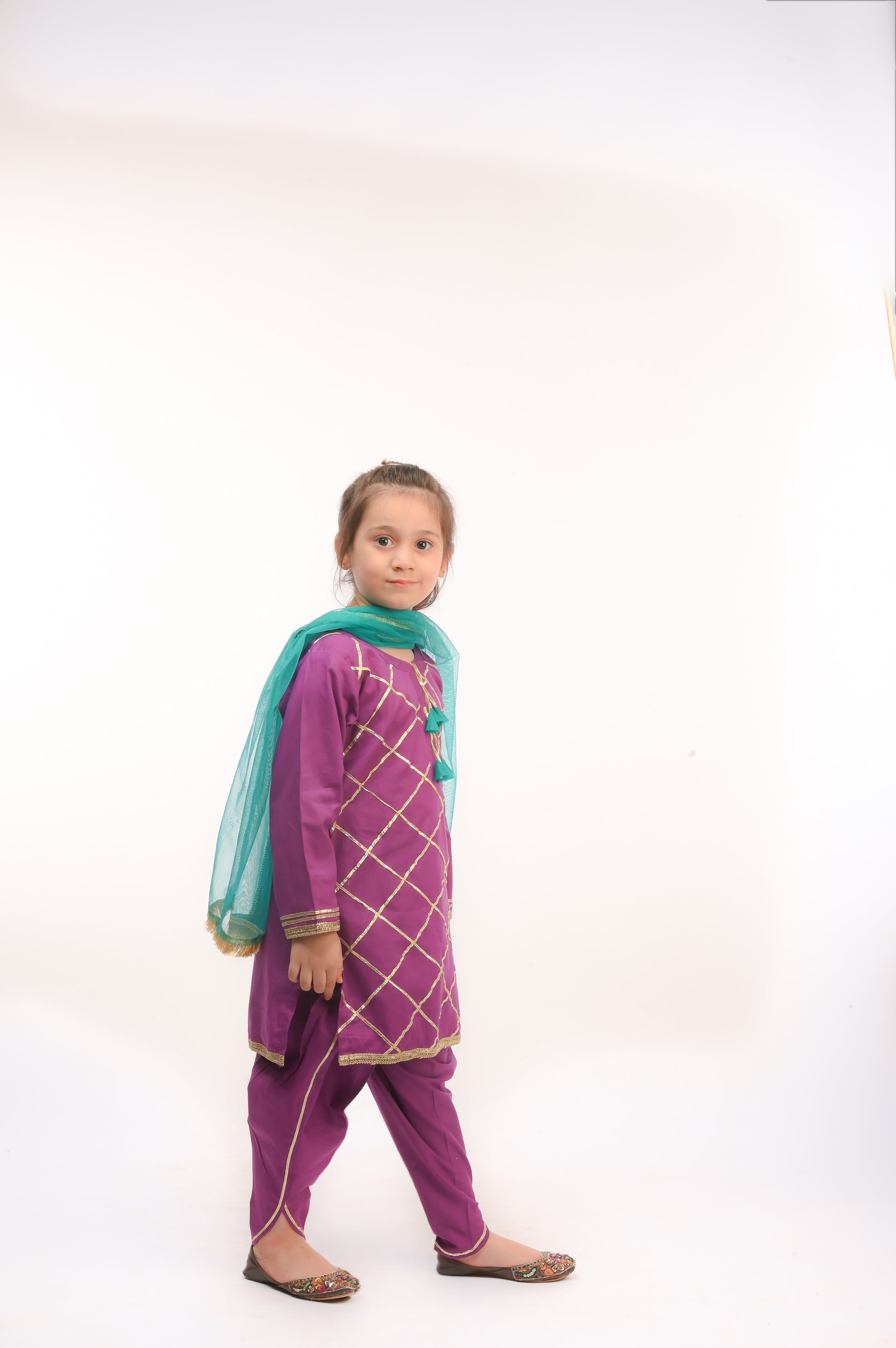 3 piece Purple Cotton Tulip Suit with Sea Green net Dupatta & Golden Laces.(Stitch).