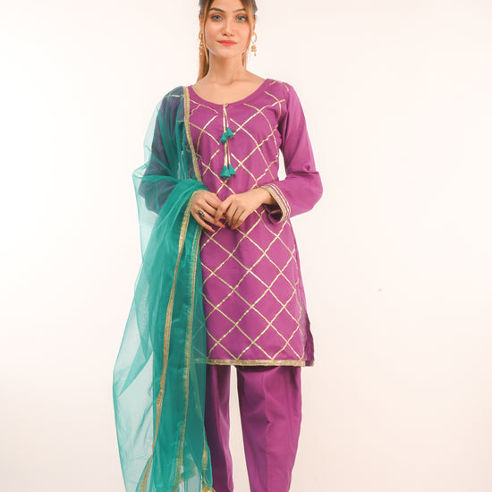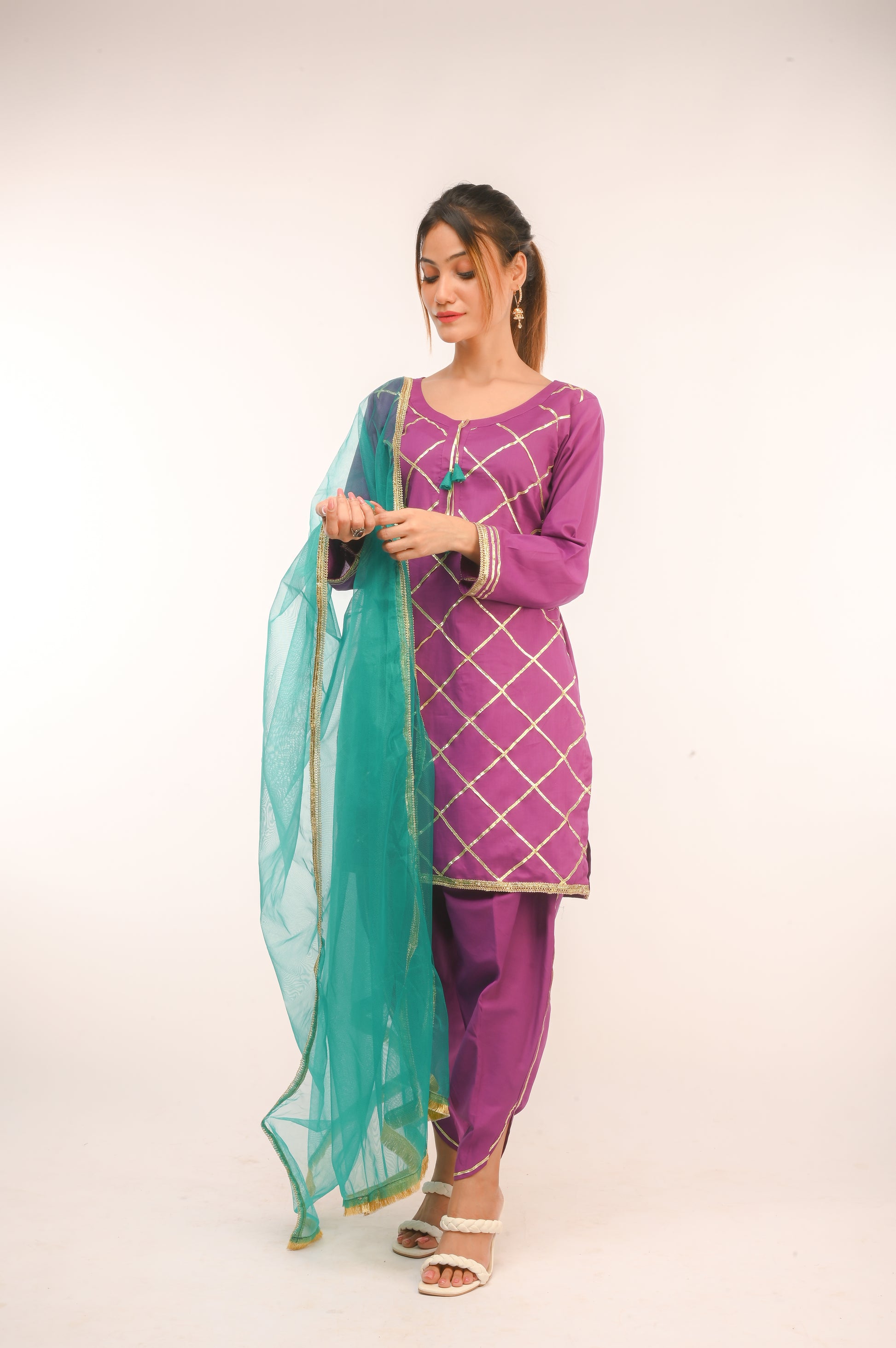 3 piece Purple Cotton Tulip Suit with Sea Green net Dupatta & Golden Laces.(Stitch).