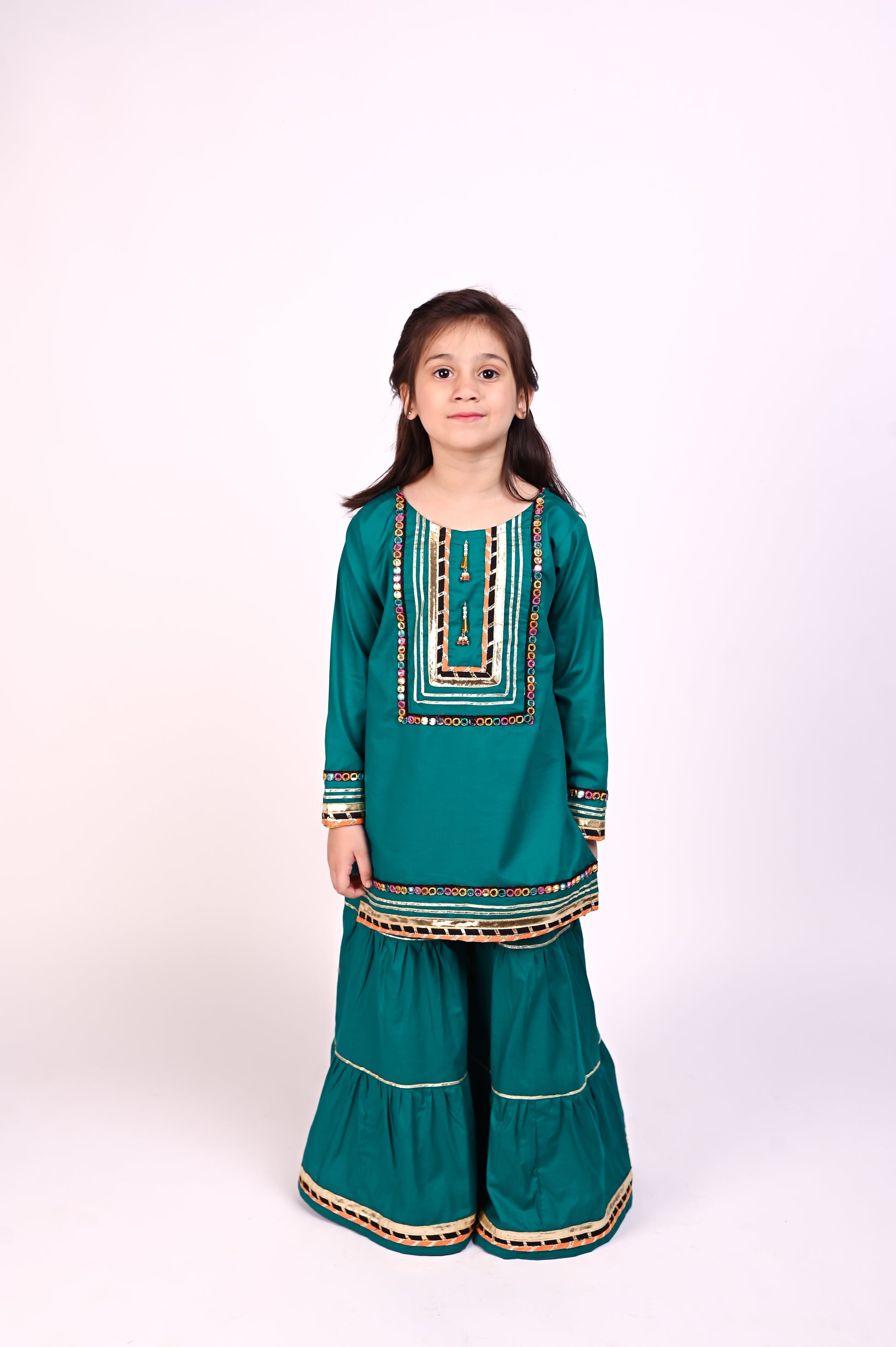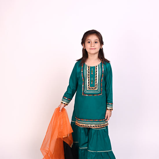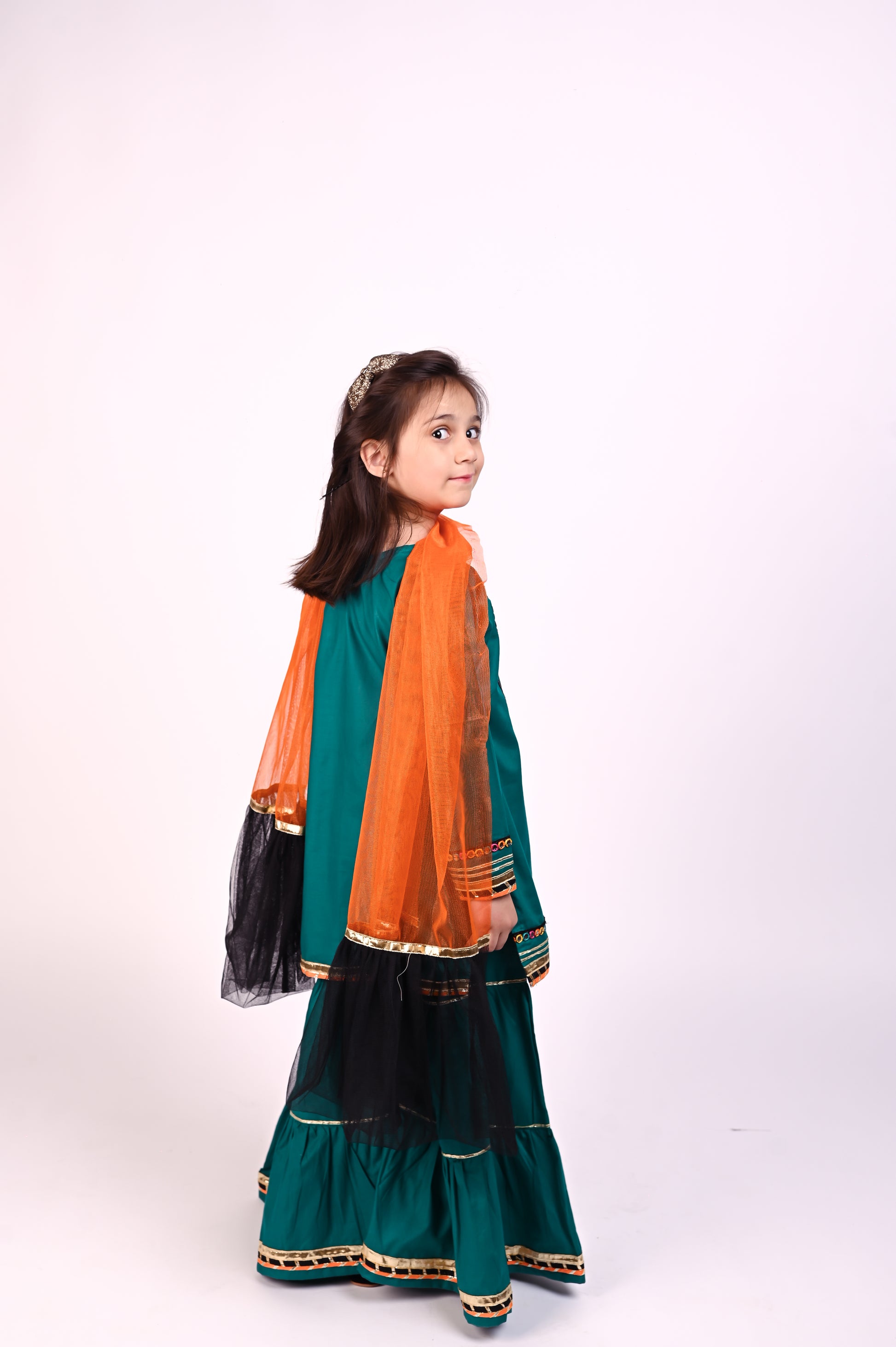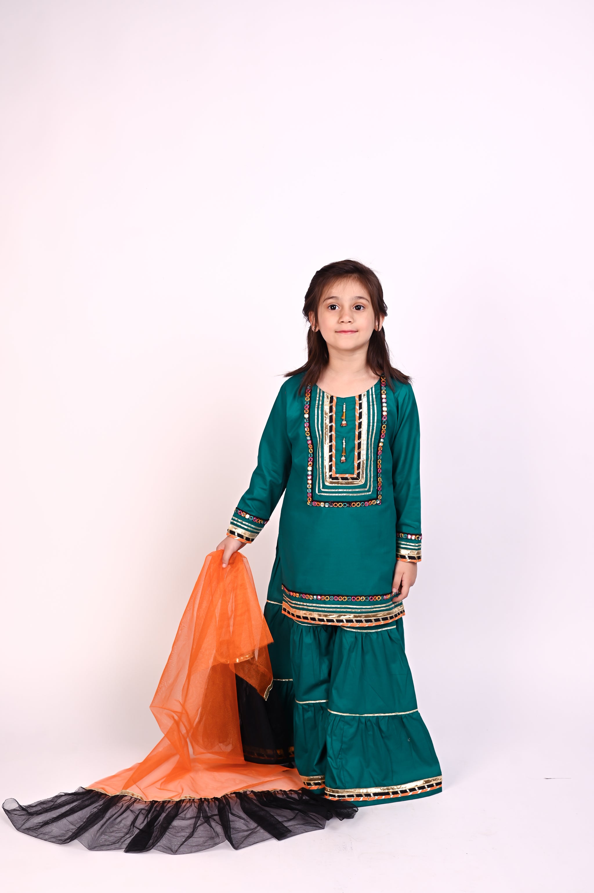 3 piece Sea Green Cotton Gharara Suit with Orange & Black frill net Dupatta & Multicolor mirror Laces.(Stitch)