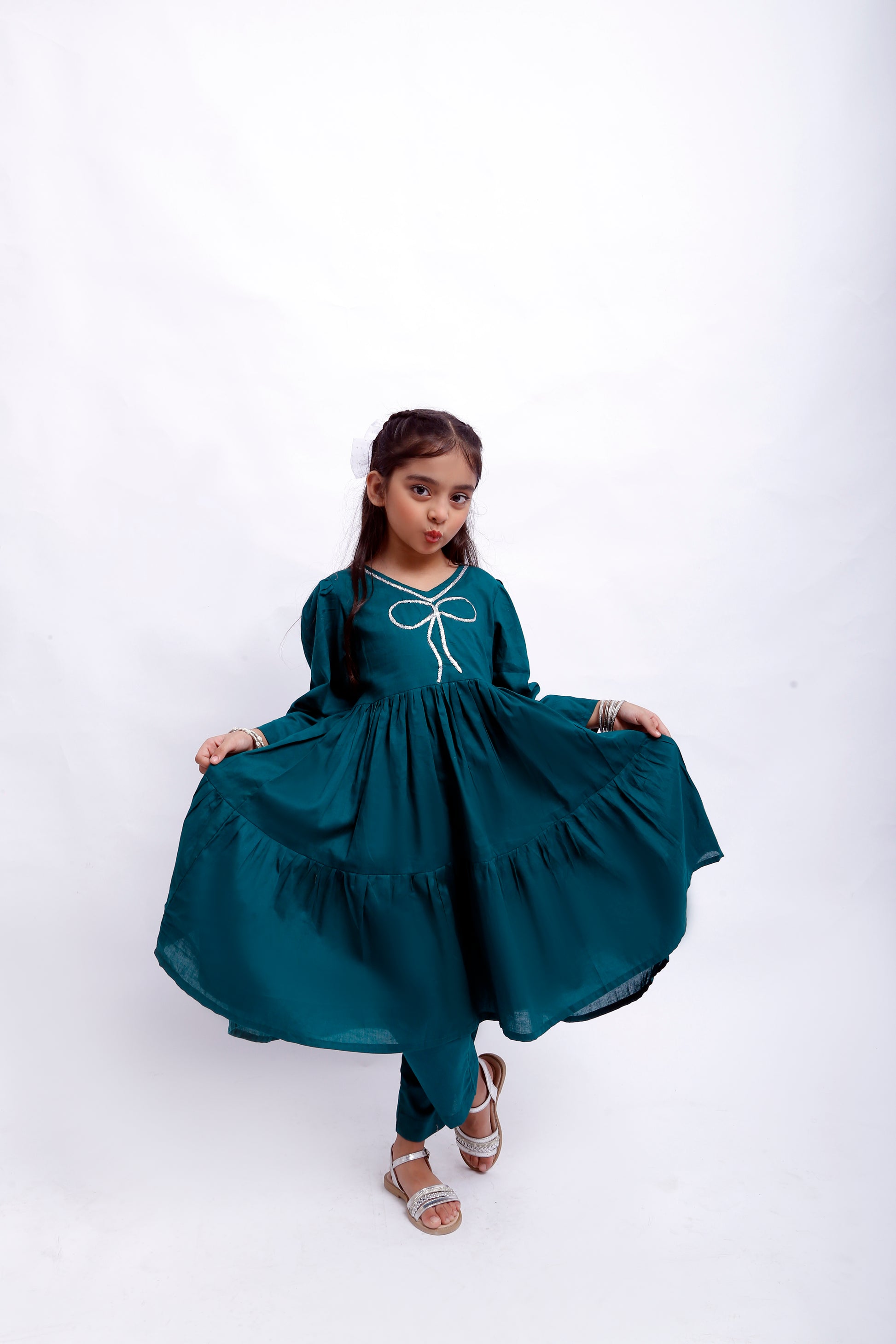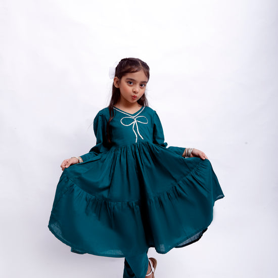 Sea Green Frock: Crafted in premium cotton fabric, adorned with Silver Sitara Lace detailing for a graceful, festive look.