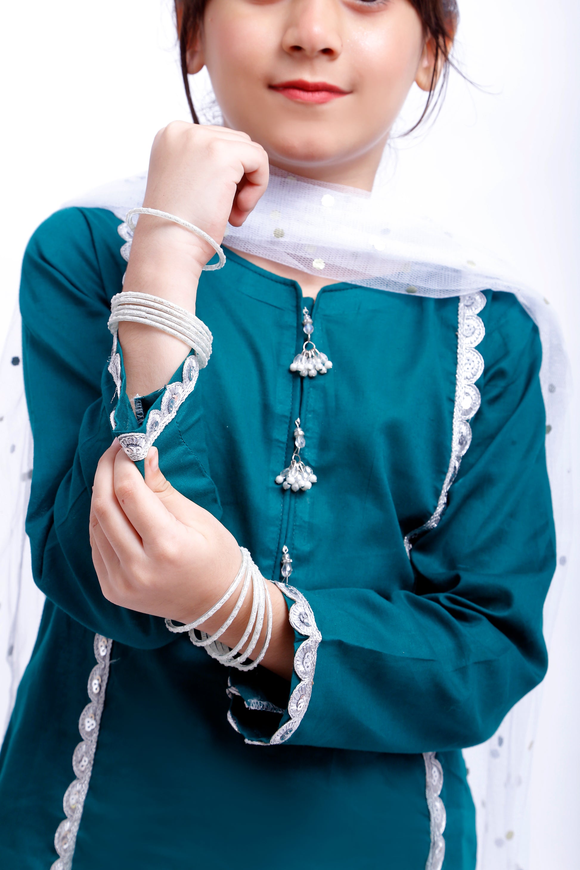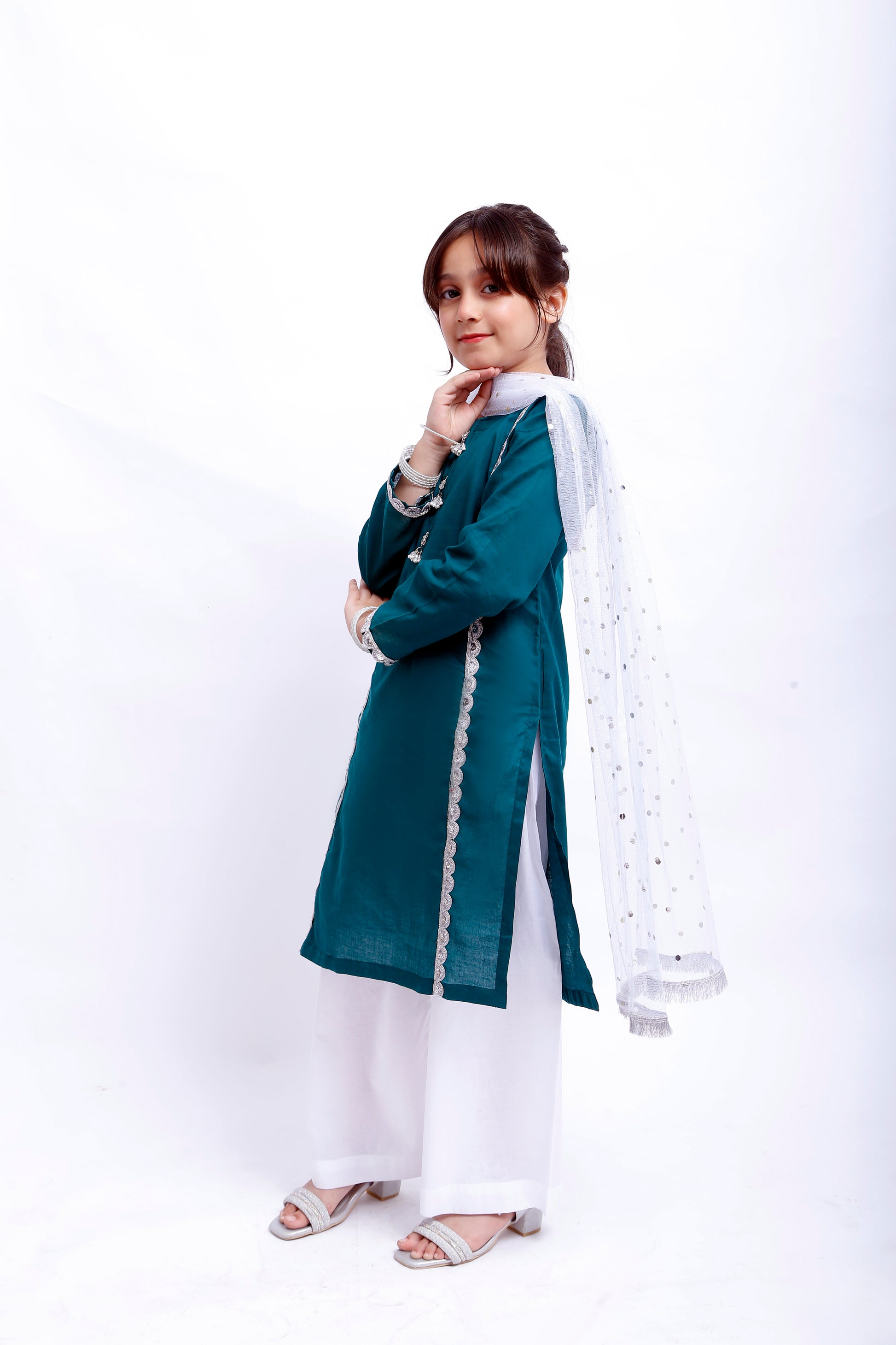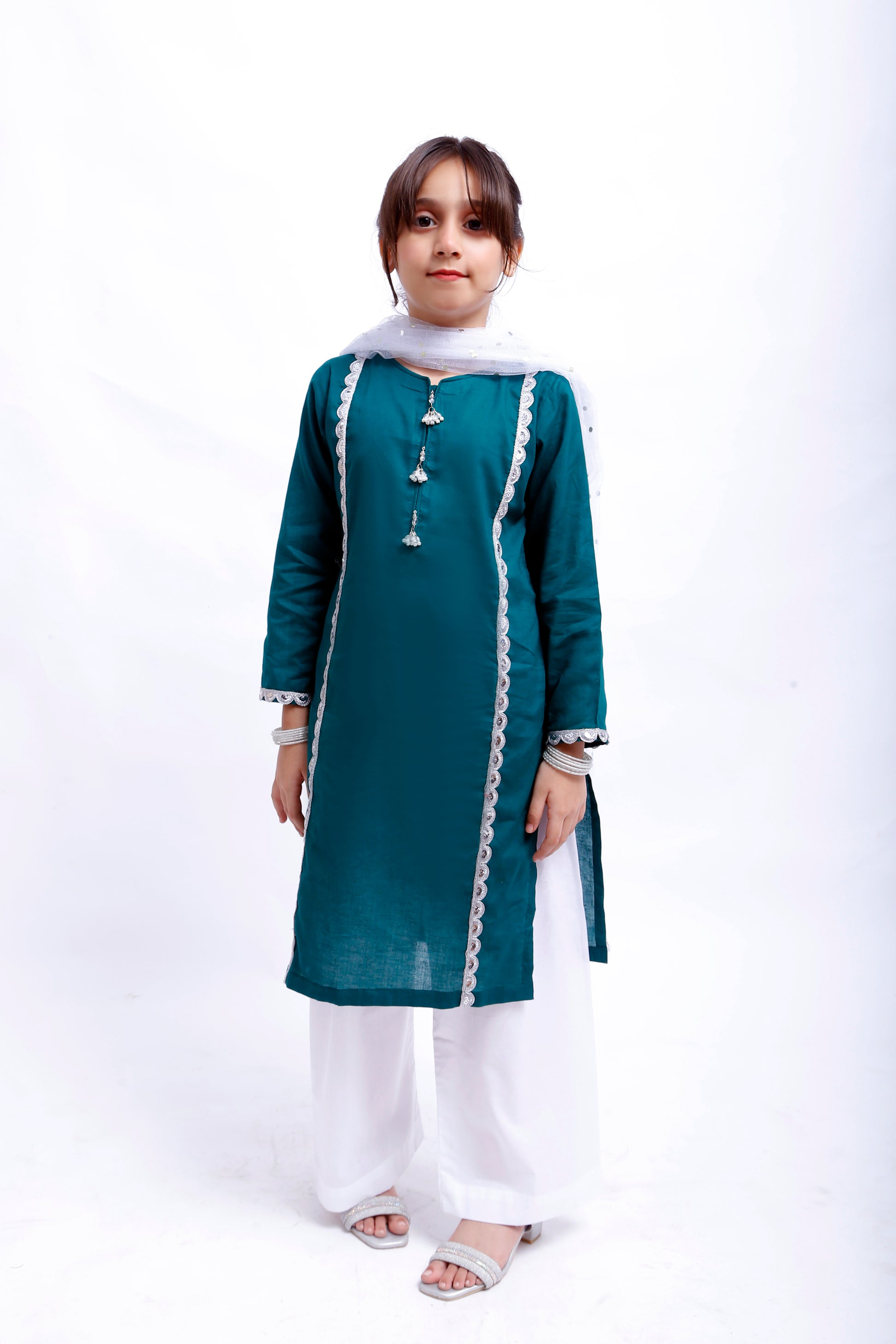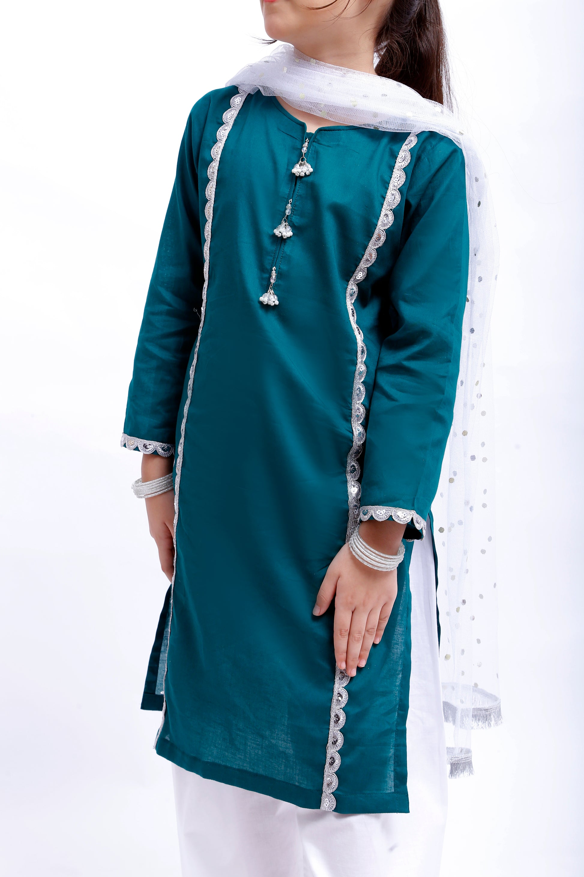 3 piece Sea Green Shirt & White Trouser Cotton Suit with White/Silver Chan net Dupatta & Silver Laces(Stitch)
