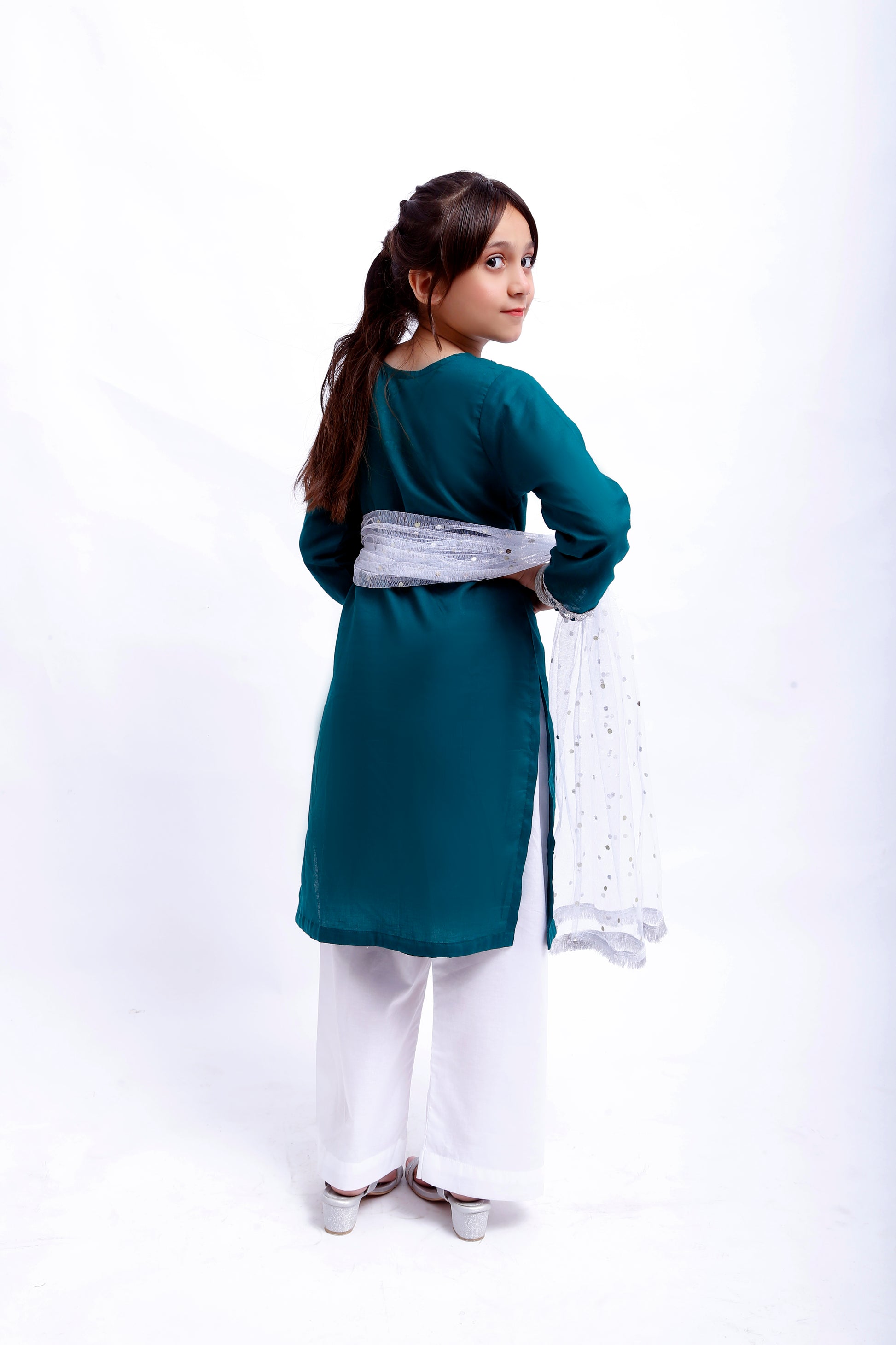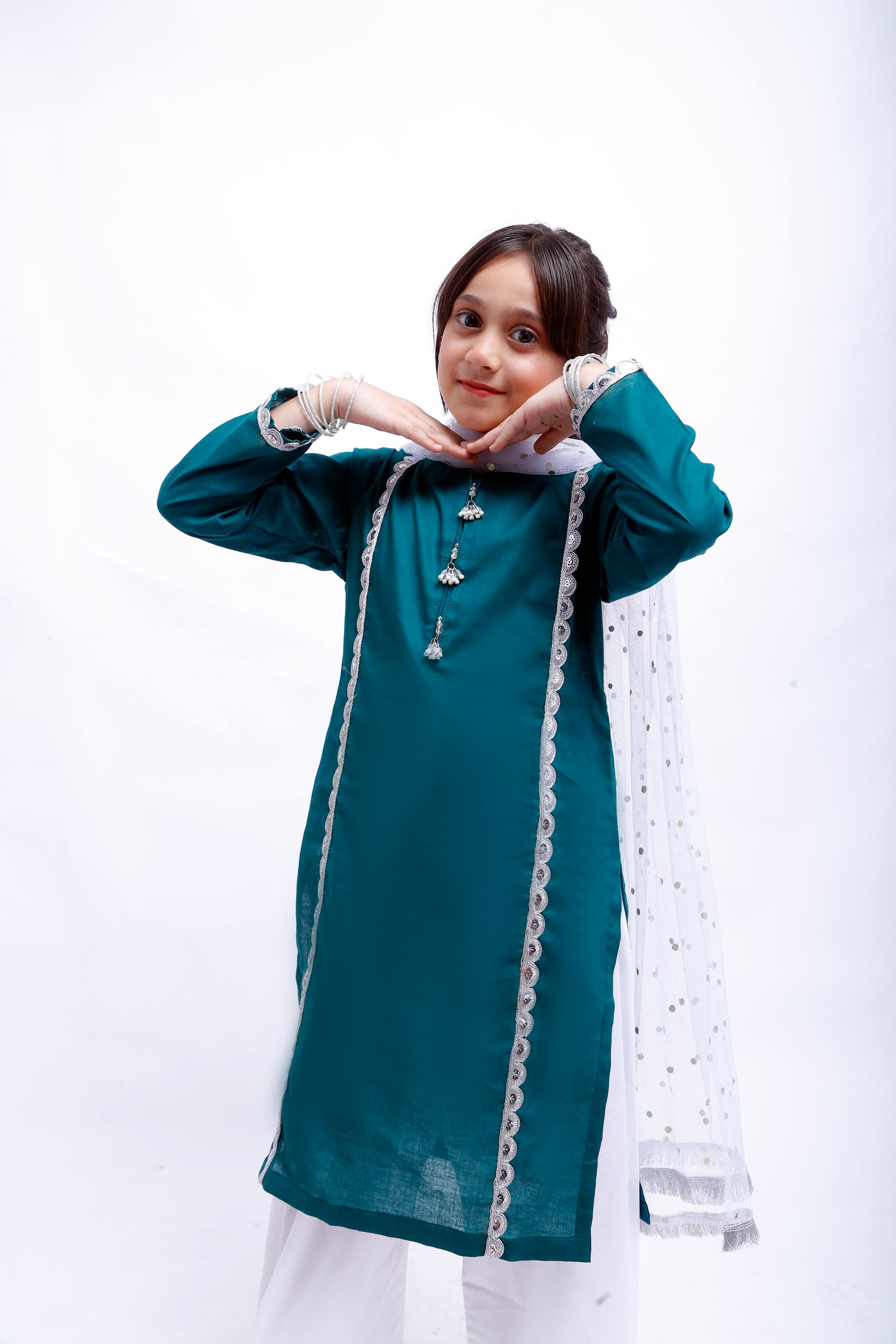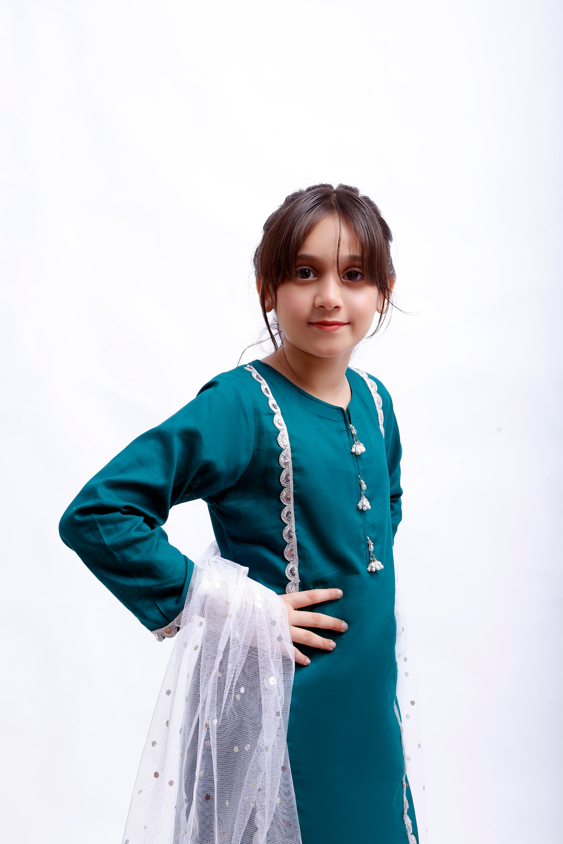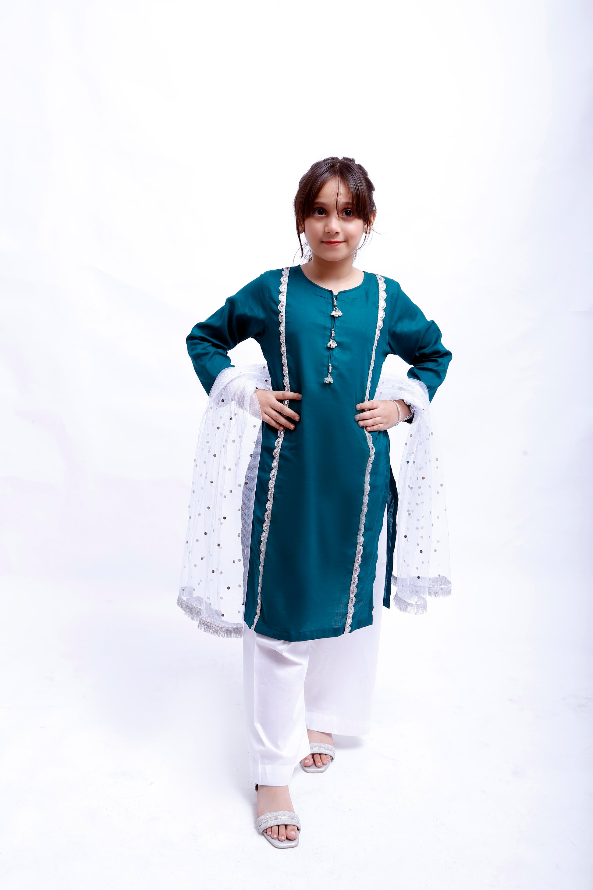 3 piece Sea Green Shirt & White Trouser Cotton Suit with White/Silver Chan net Dupatta & Silver Laces(Stitch)