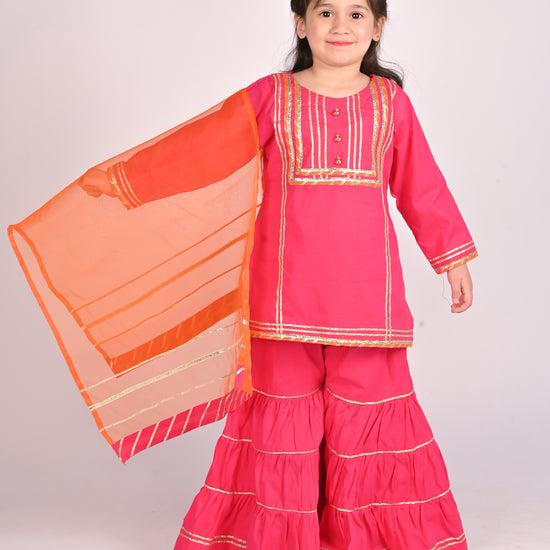 3 piece Shocking Pink Cotton Gharara Suit with Orange net Dupatta & Laces.(Stitch).