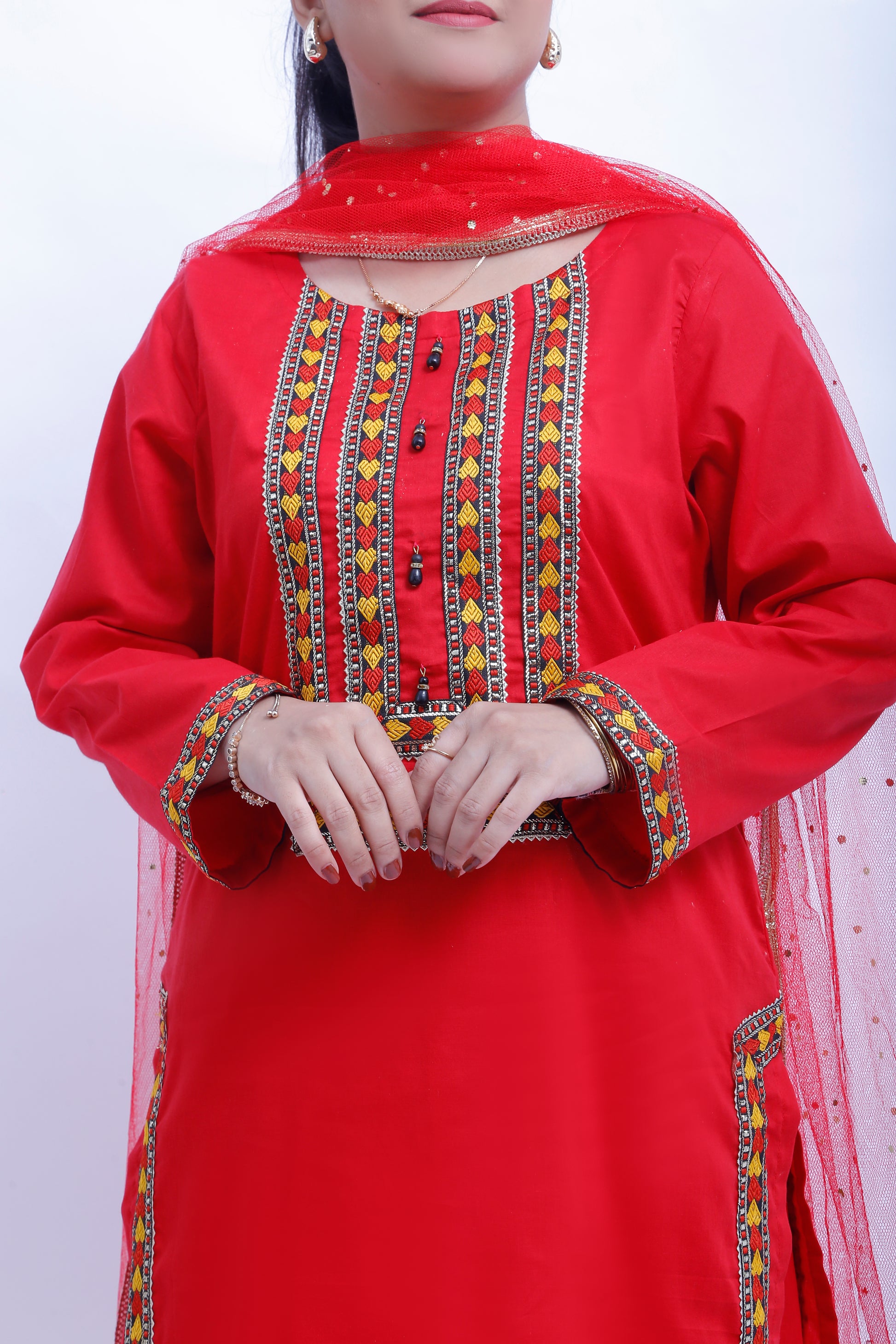 3 piece Stunning Red Cotton Plazo Suit with Beautiful Multicolor & Golden Laces & Red chan net Dupatta. (Stitch)