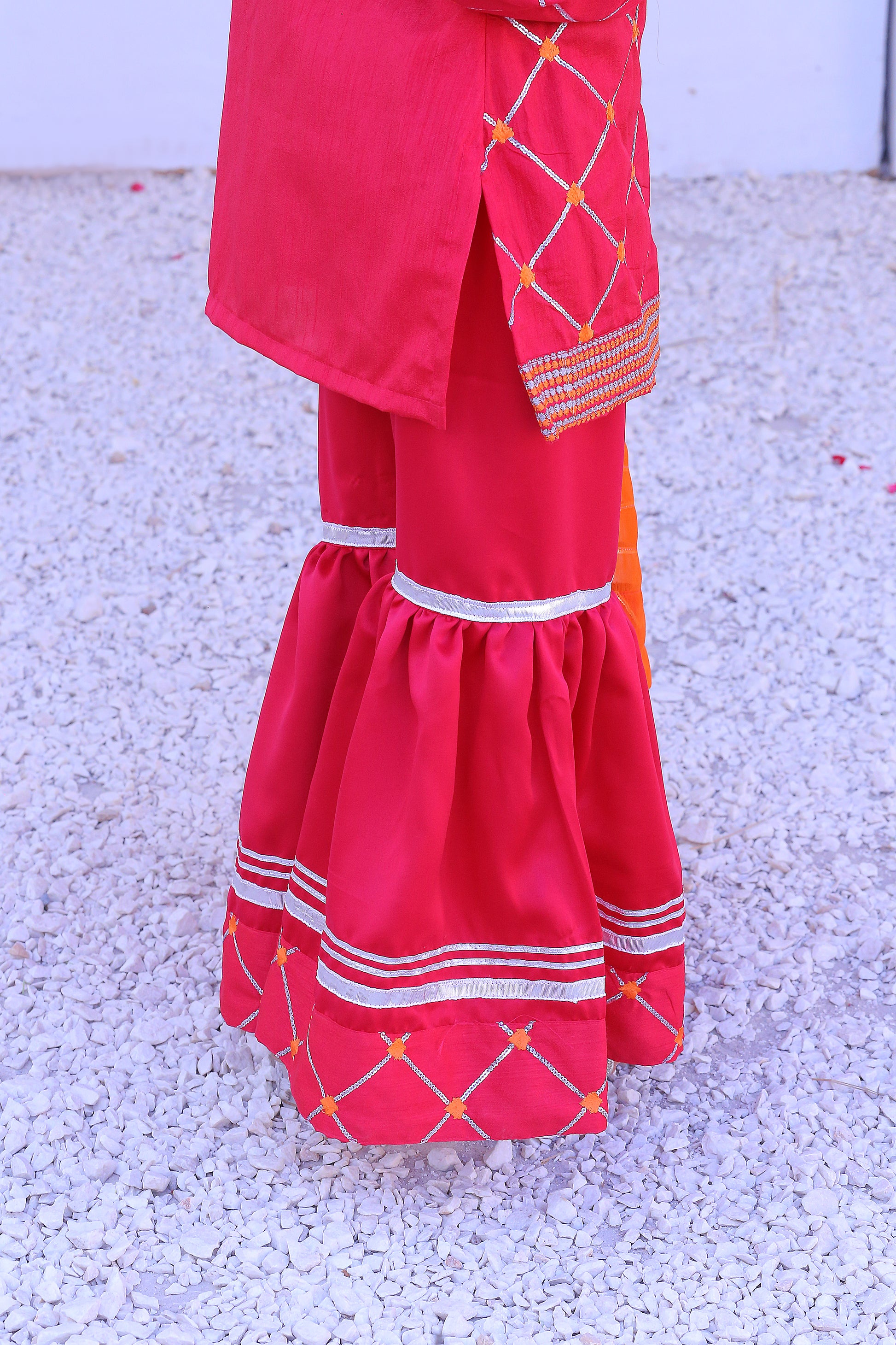 3 piece Stunning Shocking Pink Silver Embroidery Raw Silk Gharara Suit with Orange Chiffon Dupatta & Silver Laces.(Stitch)