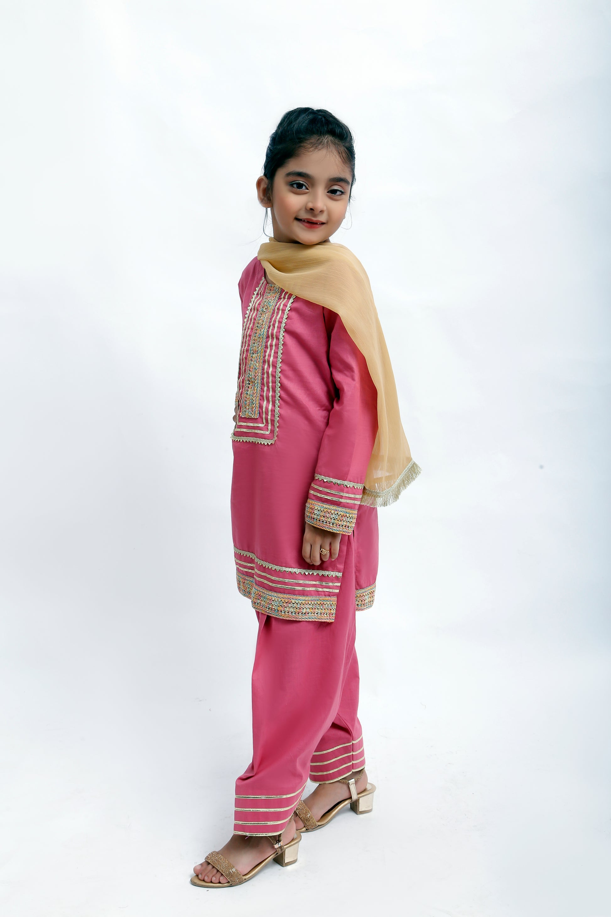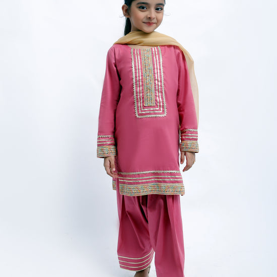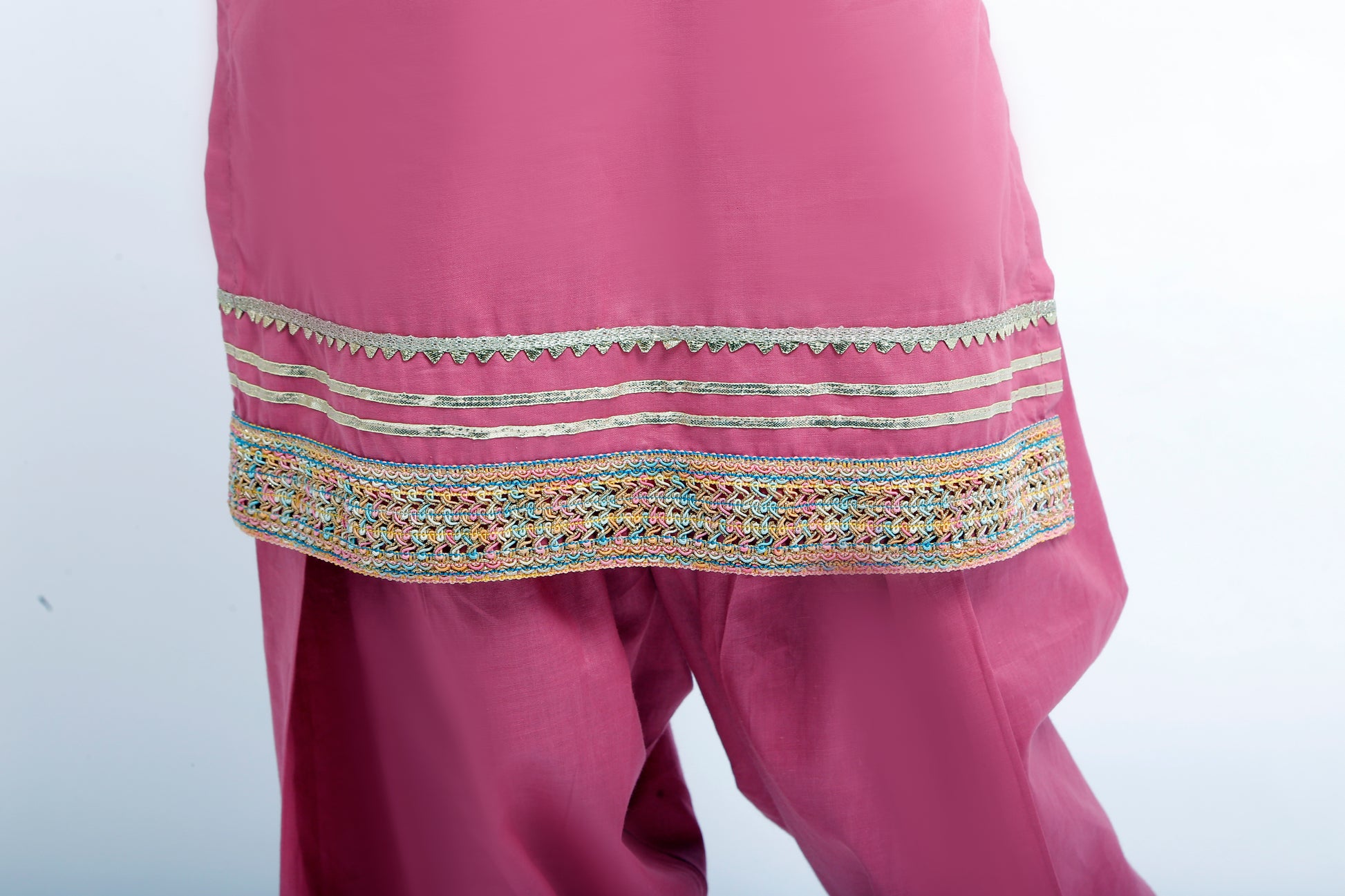 3 piece T-Pink Cotton Plazo Suit with Multicolor & Golden Laces & Golden Chiffon Dupatta. (Stitch)