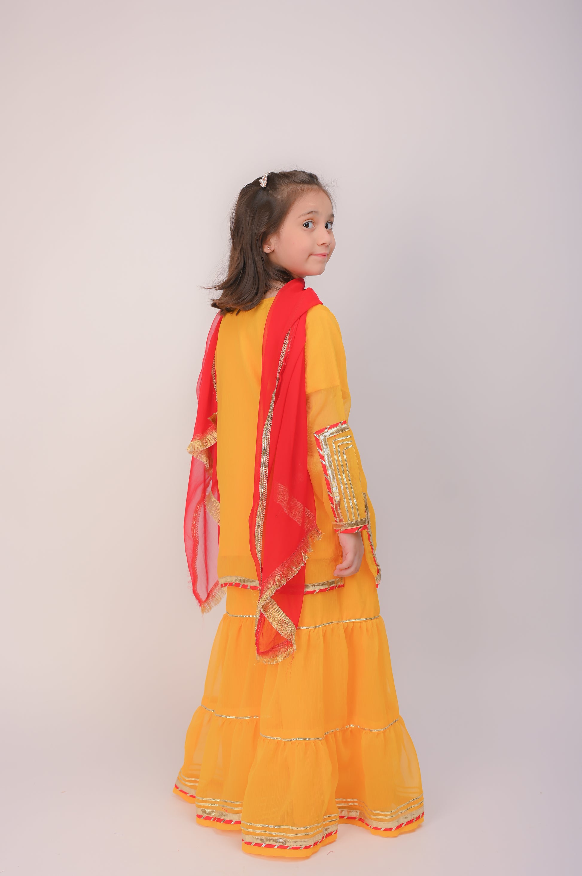 3 piece Yellow Chiffon Gharara Suit with Red Chiffon Dupatta with Laces.(Stitch).