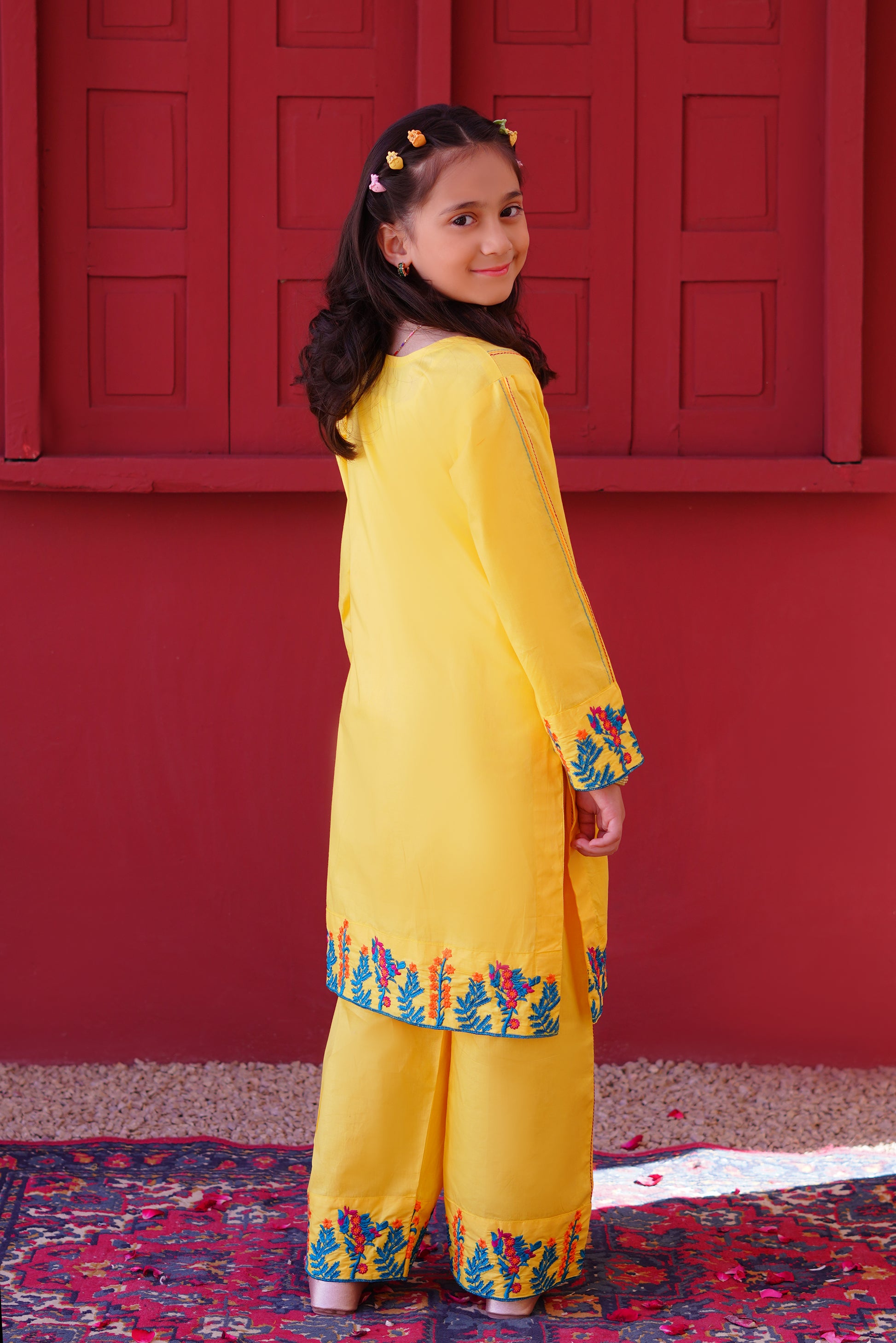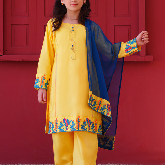 Premium Export Quality – Beautiful 3-Piece Yellow Embroidered Cotton Palazzo Suit (Stitched).